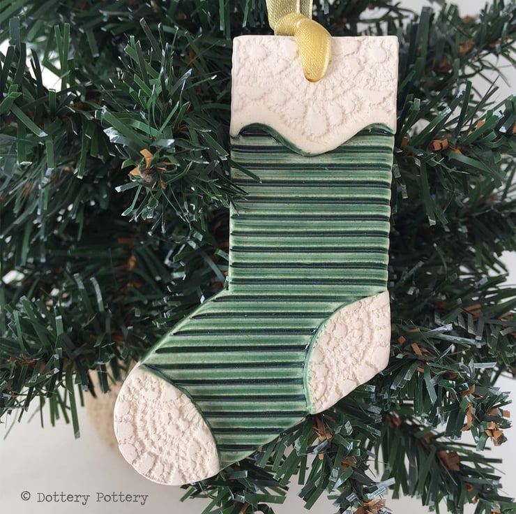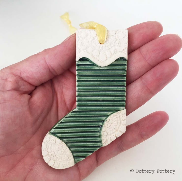 This cute green stocking has been embossed with pattern and finished with a red, glossy glaze to the front. The back has been left plain. It measures 9 x 7cm.