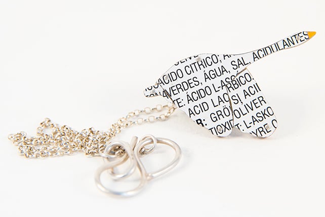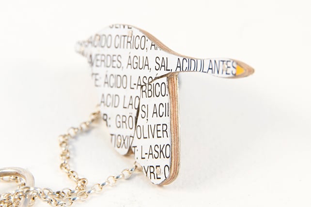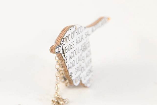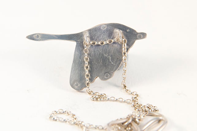 This Necklace is made by collaging old tins that I collect. Which means that each one is individual. I have a large collection of tins and sift through them all to find the right colours. I try and pick colours as close as possible to the bird. In this case a Swan, which is a snowy white with an orangey beak. Each piece is cut out with my piercing saw and filed so it fits properly.