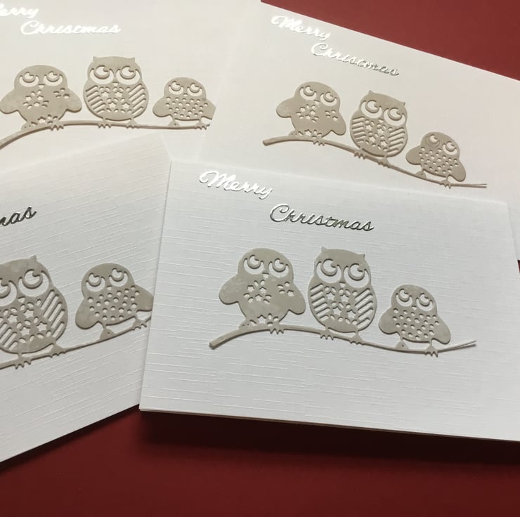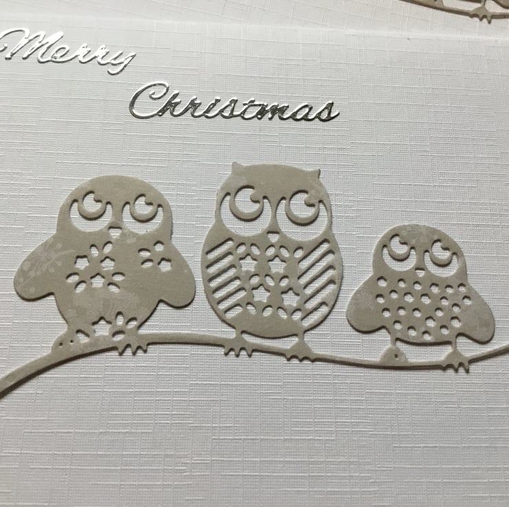 Three cute little owls sitting on a branch makes a lovely picture for a lovely handmade Christmas card.