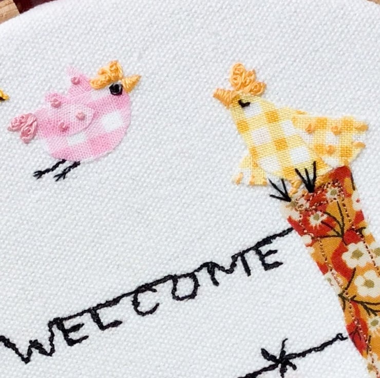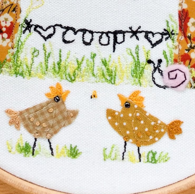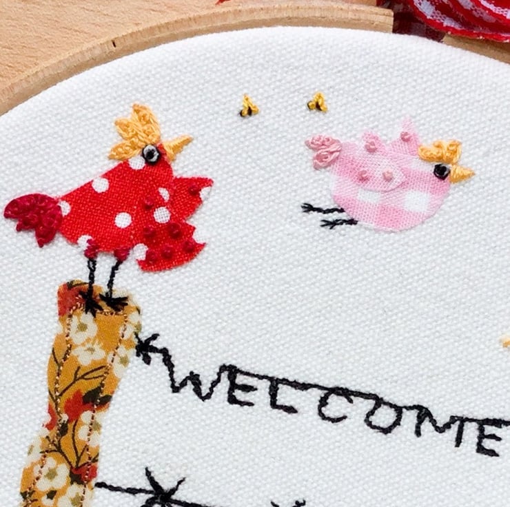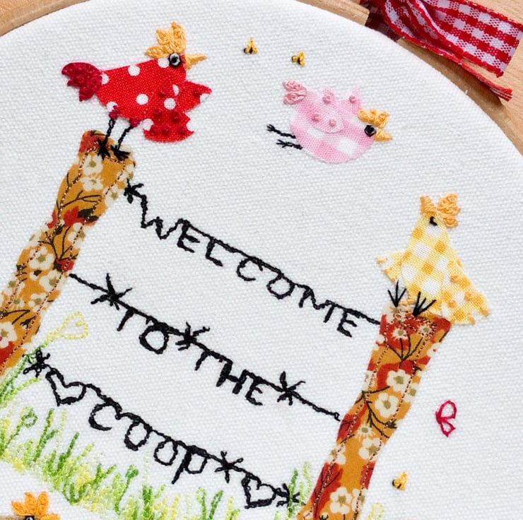 This design “Welcome to the coop” has all my favourite elements, freemotion and hand embroidery. I have used Liberty fabric for the fence posts and gingham and dots for the tiny chicks bodies and wings. A felt snail and toadstool house below and french knot stitch bees and butterflies above. Definitely stitched to make you smile! Offered on Seconds Sunday sale, to try to make way for more cheeky chick designs!…