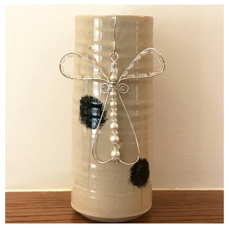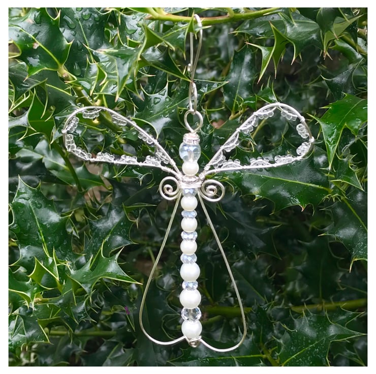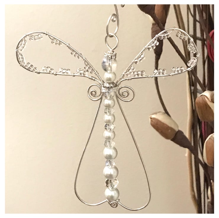 I have created this Angel with silver plated wire by forming it into an angel shape using wire wrapping techniques. I have threaded white glass pearls, Czech clear crystal beads and a Rhinestone spacer bead onto silver plated wire to form the centre of the Angel. These beautiful Czech crystal beads sparkle when they catch the light. Crystal clear coloured seed beads are wrapped around the angel’s wings. A handcrafted silver plated hook is included to hang the Angel.
