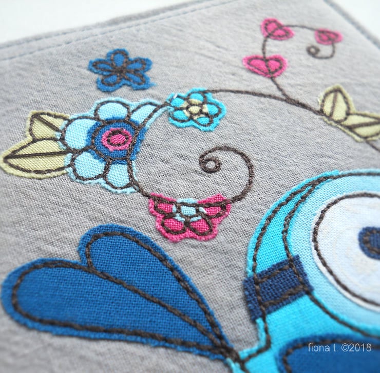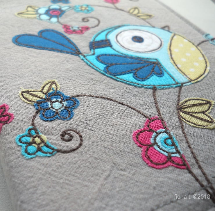 inspired by the glorious summer, the little bird and swirly floral design on this embroidered cover features a co-ordinating combination of bright coloured cottons. each tiny component is hand-cut and (so patiently!) layered then appliqued onto hand dyed cotton calico. the detail is stitched on freestyle, using the free motion embroidery technique.