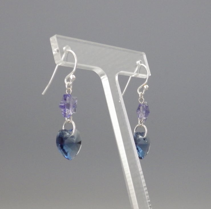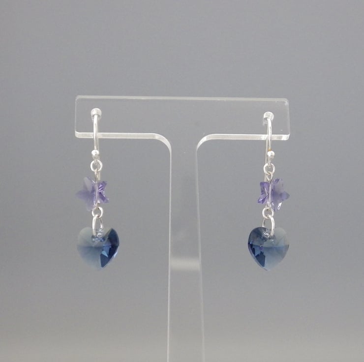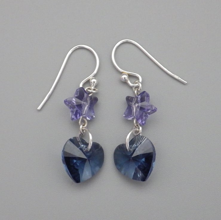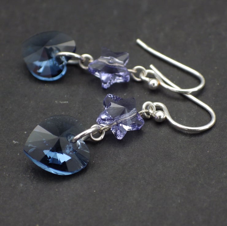 These denim blue Swarovski heart drops have been teamed with tanzanite purple shade Swarovski faceted star beads to create simple charming earrings finished using Sterling Silver findings. Made with love to feed your romantic side!