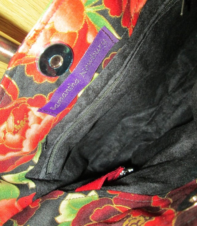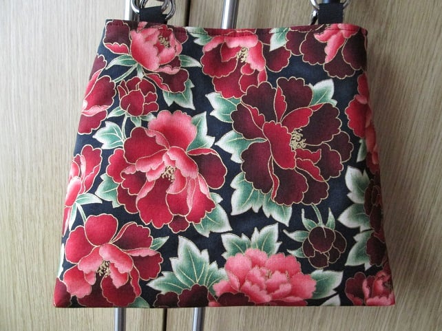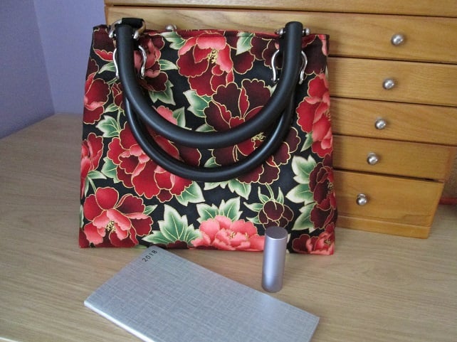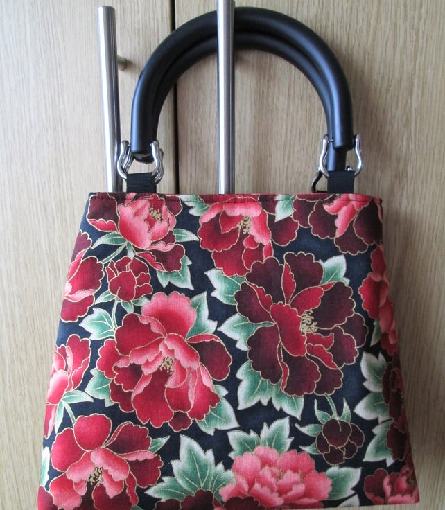 A smart little handbag that would work for both day and evening in a gorgeous print of red and pink paeonies, picked out in metallic gold, on black. The fabric speaks for itself and I've teamed it with a set of simple matt black handles and a black cotton lining. Inside there is a handy key hook and zipped pocket as well as plenty of space for all the essentials.