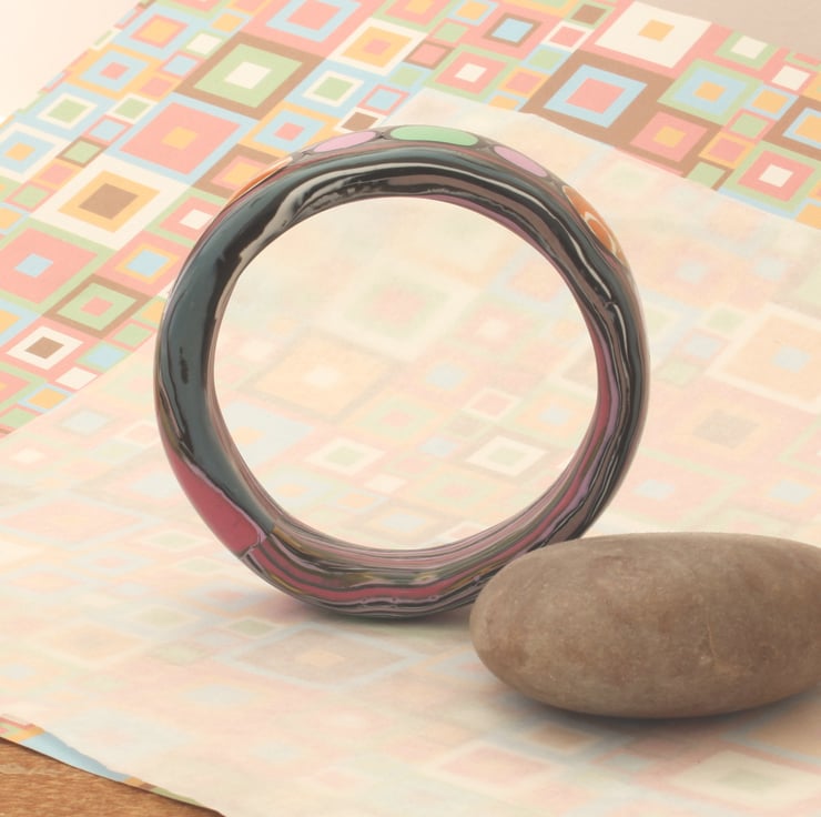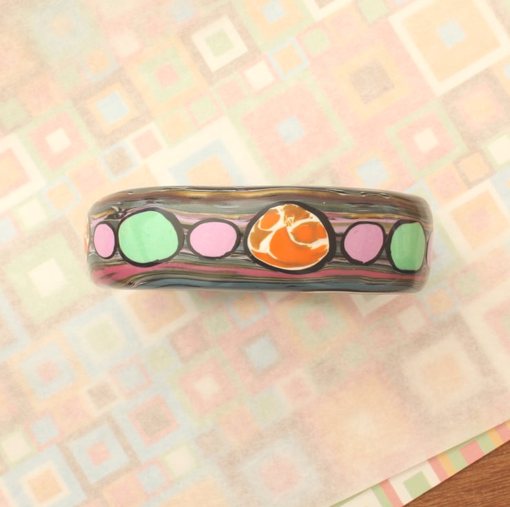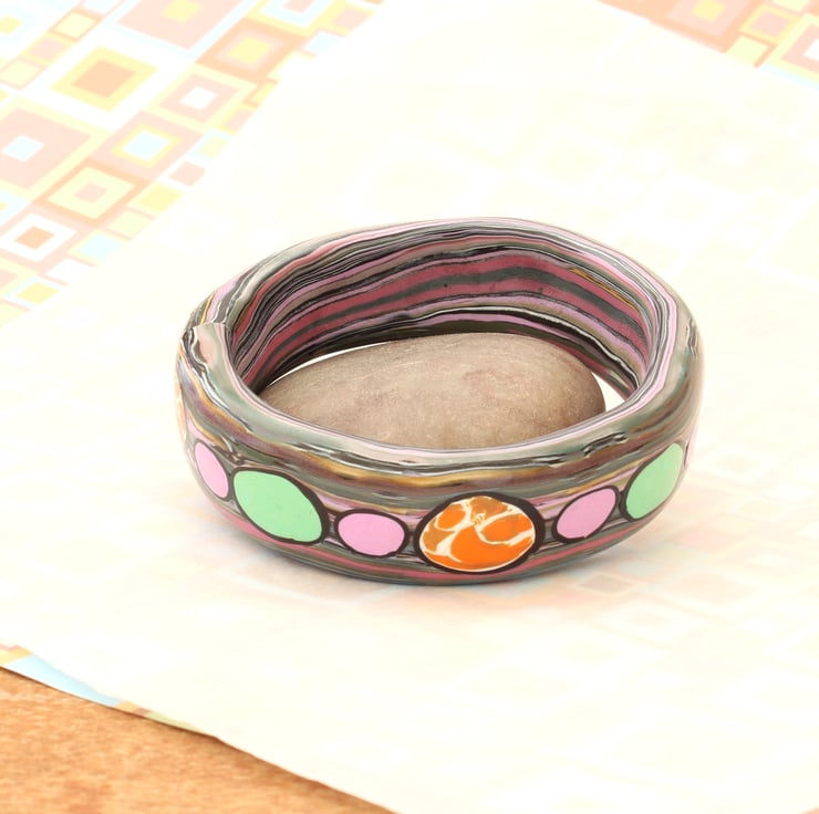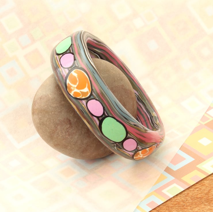 This is a unique piece - very original - made by myself and ready to go. It is made entirely from polymer clay - excellent lightweight and hard-wearing stuff that will keep those lush tones forever. The bangle has been shined and polished to a fine degree.