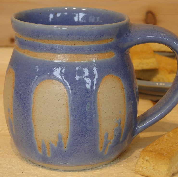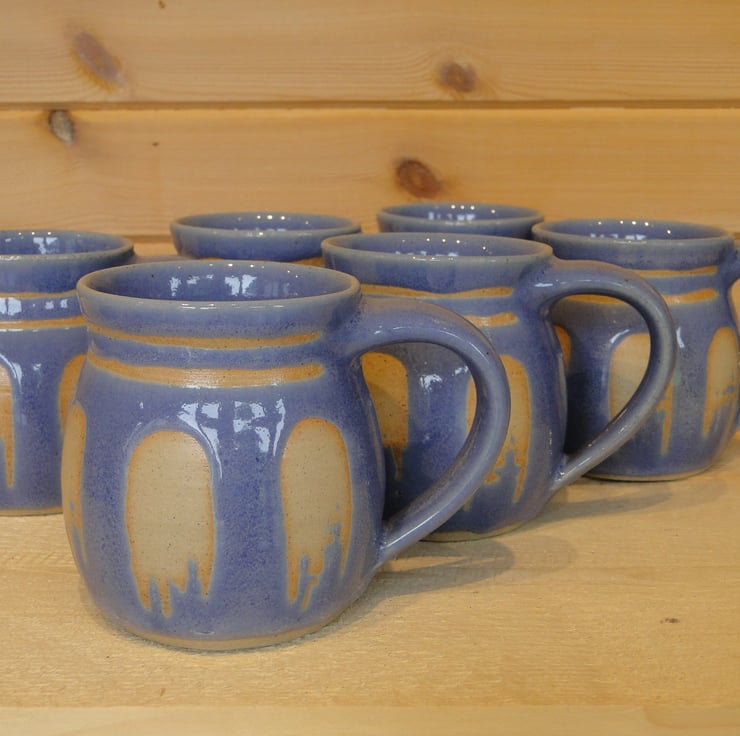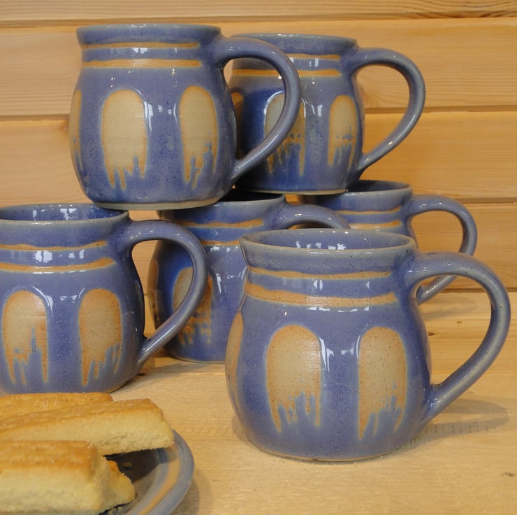These large mugs are approx 3.5"/9.5cm tall x 3"/7.5cm wide at the rim. They are all hand thrown and have hand pulled handles. They are finished in a blue glaze with a wax resist decoration that reveals the buff clay body. They are comfortable and well balanced in use and the shape keeps the contents hot. Dishwasher and microwave safe.