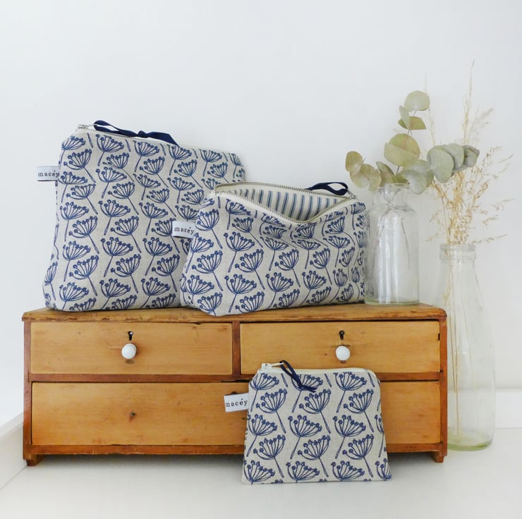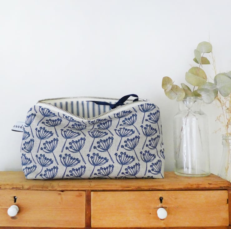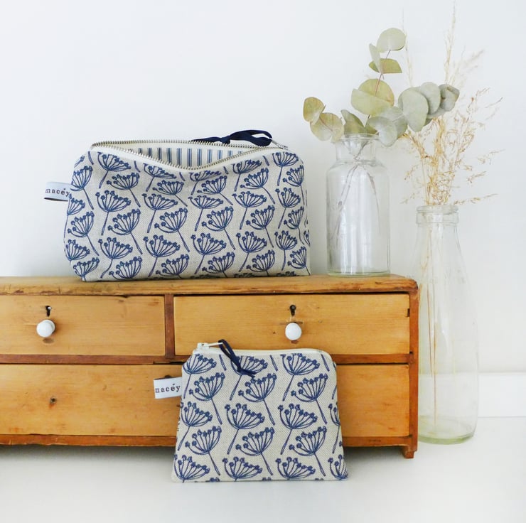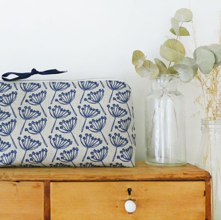 This pouch is the perfect size to use as a make up bag or pencil case. Charlotte's Cow Parsley print has been developed from her original floral embroideries, printed on linen and cotton.