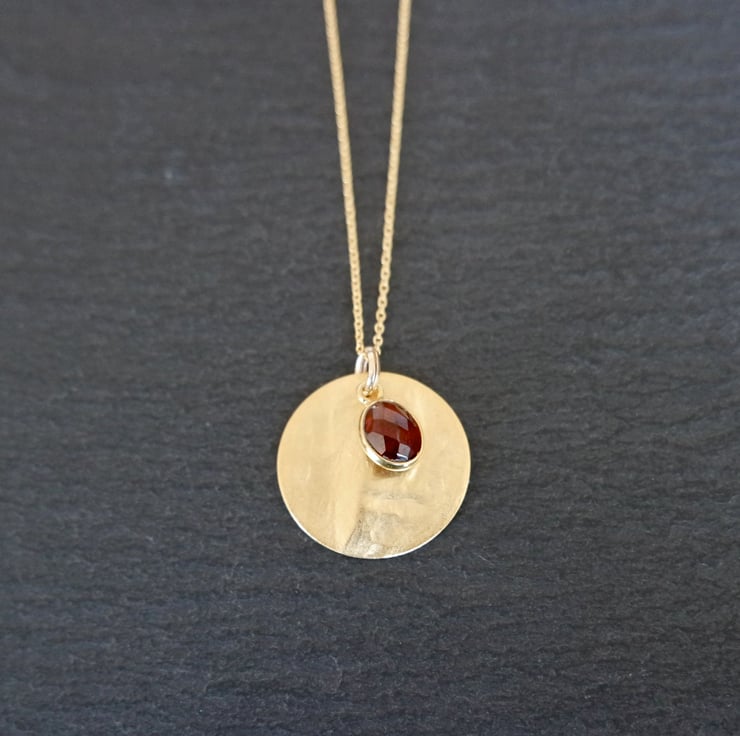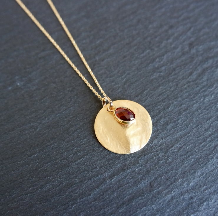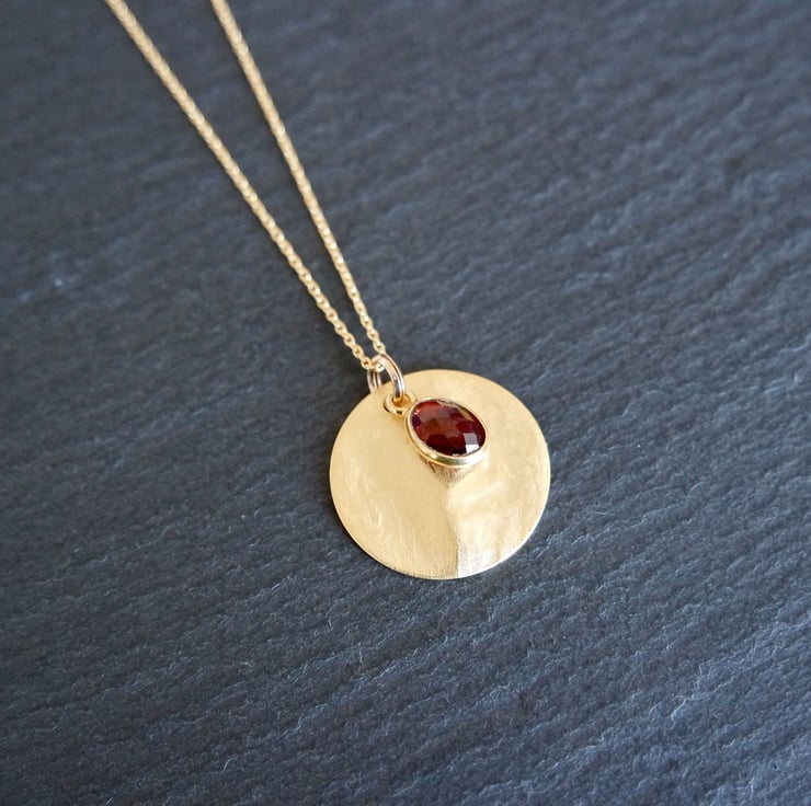 A gold Vermeil (that's gold-plated 925 Sterling Silver) necklace with a gold plated hammered disk and a faceted deep red garnet charm in a gold Vermeil setting.