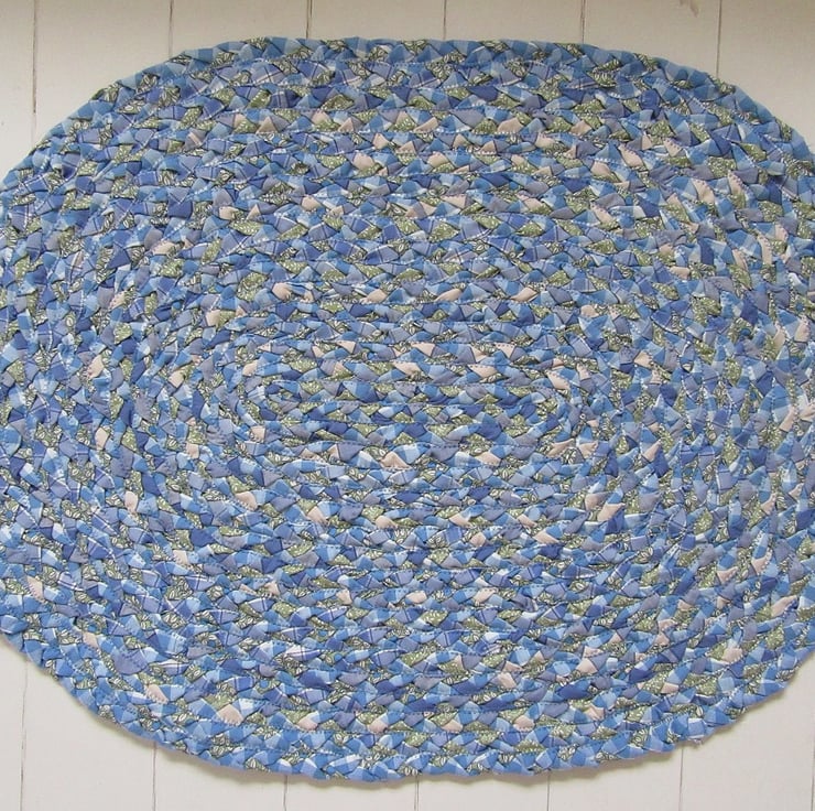 A hand braided large oval rug using 100% cotton fabrics. The three different fabrics are crisp and fresh: Pastel blue and white check, a Laura Ashley fabric; Oxford blue and white check; Apple green floral. It has been machine sewn together for extra strength using a blue thread. I have washed my own braided rugs on a gentle 30' wash and line dried them. Perfect in front of the Aga, bathroom or back door.