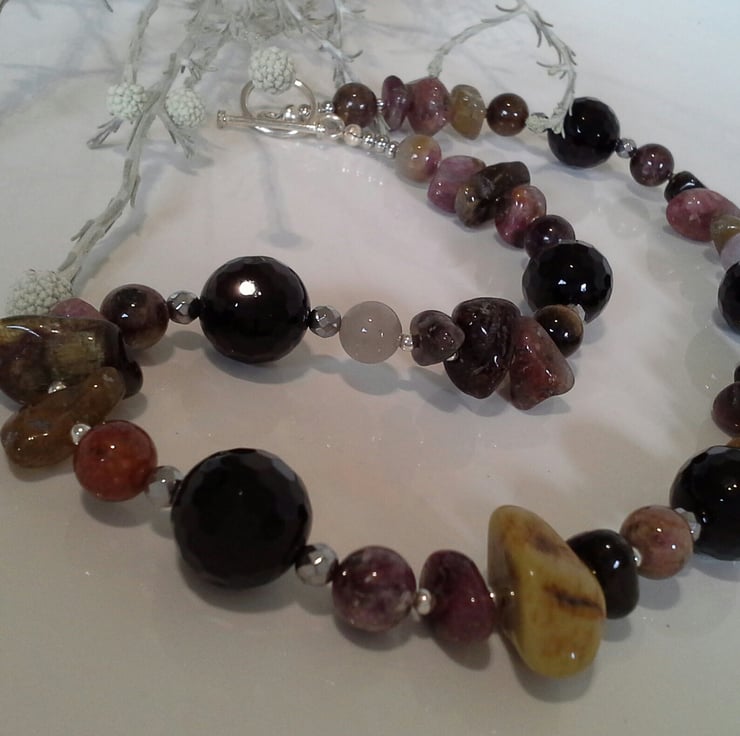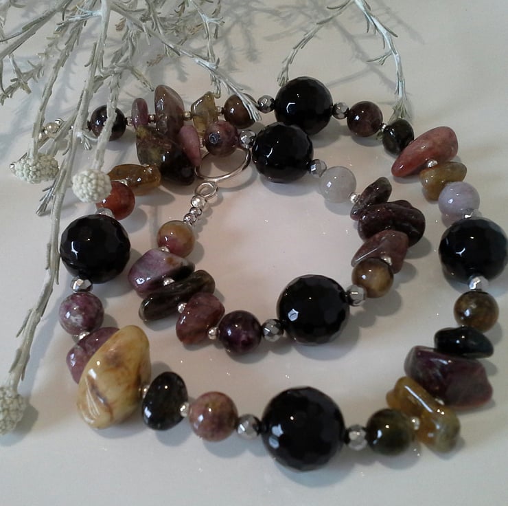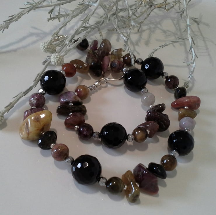 A striking necklace designed and hand created using genuine tourmaline pebbles and 6mm tourmaline rounds and 12mm jet black faceted onyx round gemstones with genuine faceted 3mm silver finish heamotite rounds on either side of the onyx rounds. . Between each tourmaline gemstones are 2mm quality silver plated spacer beads. For the necklace construction professional stainless steel jewellers wire has been used for added strength and lasting durability finished off with a quality silver plated toggle style clasp.