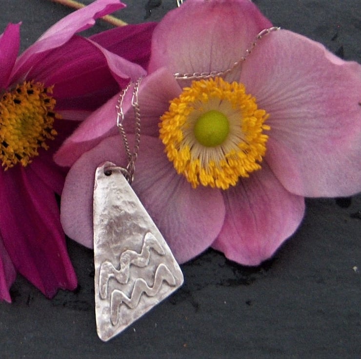 A sterling silver pendant in an offset triangle shape. Textured, it measures 33mm at the longest point. The Aquarius water-bearer symbol, hand cut and also in sterling silver, is soldered onto the front.