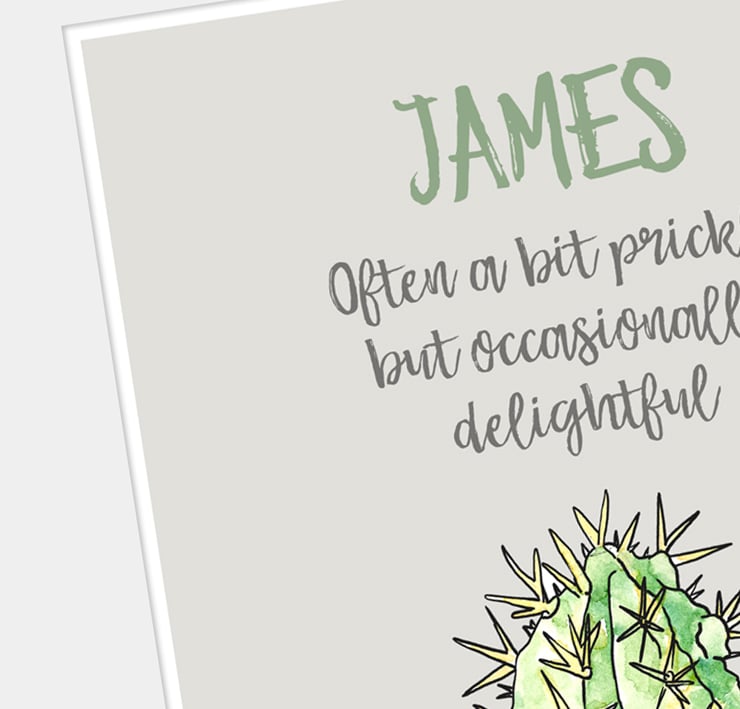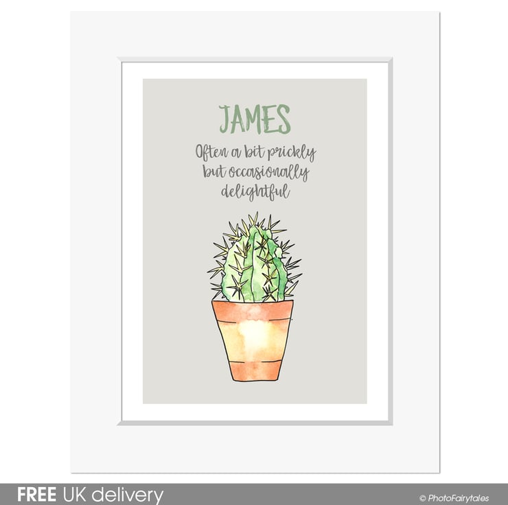 This print design features a gorgeous watercolour cactus image and attractive brush style script, on a soft neutral coloured pale taupe background shade. The wording featured on the print is: "Often a bit prickly but occasionally delightful", and it's personalised with your chosen first name. You're very welcome to change the wording however, just let me know!
