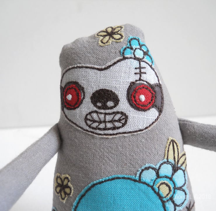 freehand embroidered fancy floral zombie sloth – (medium / pocket sized) - blue / teal / turquoise