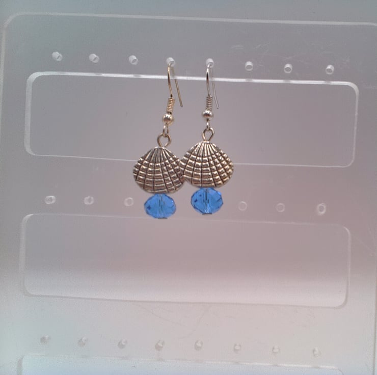 This pretty pair of silver clam shell charm and blue crystal earrings will go well with any outfit you wear everyday or for an evening out. They would make a lovely gift for a friend or relative for a birthday or anniversary, or a treat for yourself. They are made using a 15 mm x 15 mm silver clam shell charm with an 8 mm x 6 mm blue crystal rondelle bead suspended on silver plated ear wires with a drop of 2.5 cm. The earrings will be dispatched wrapped in tissue paper in an organza bag and delivered to you via Royal Mail first class post.