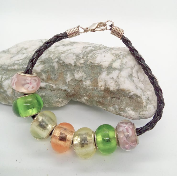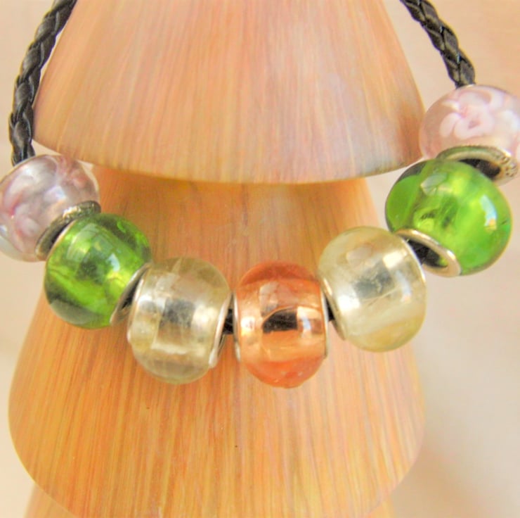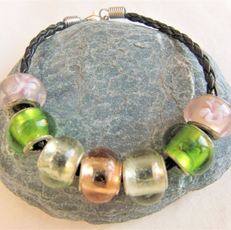 The bracelet is made using 12mm Lampwork Glass Beads in pink with a floral pattern, clear, black, green and a transparent pink, on a black plated leather Bracelet. Bracelet is 19.5cm in circumference and has a silver plated lobster clasp.