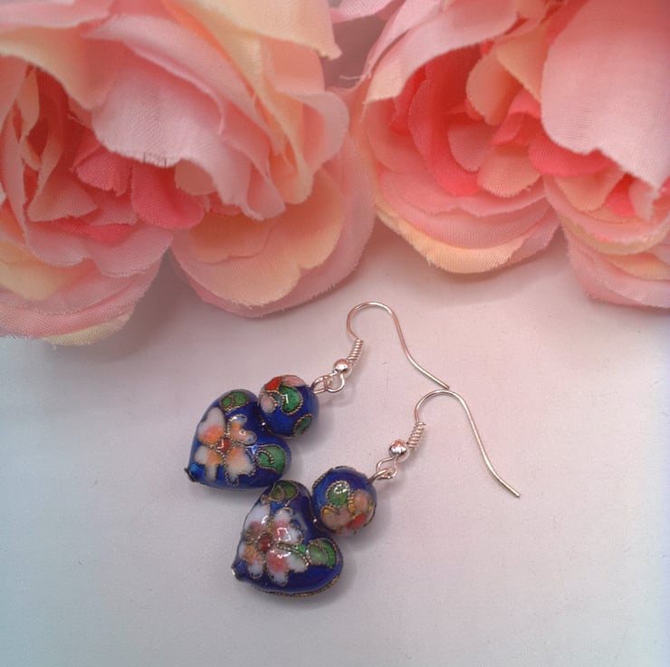 These beautiful deep blue heart shaped earrings go well with any outfit you wear everyday or for an evening out. They would make a lovely gift for a friend or relative for a birthday or anniversary, or a treat for yourself. They are made using 20 mm x 15 mm heart shaped cobalt blue cloisonne beads with a floral pattern and a 10 mm round cobalt blue cloisonne bead with a floral pattern. They are suspended on silver plated ear wires and they have a drop of 3 cm from the base of the ear wire. The earrings will be dispatched wrapped in tissue paper in an organza bag and delivered to you via Royal Mail first class post.