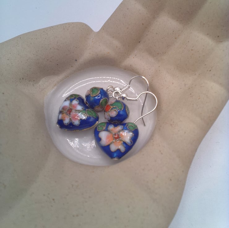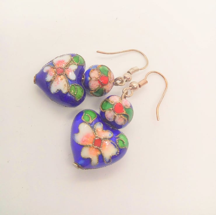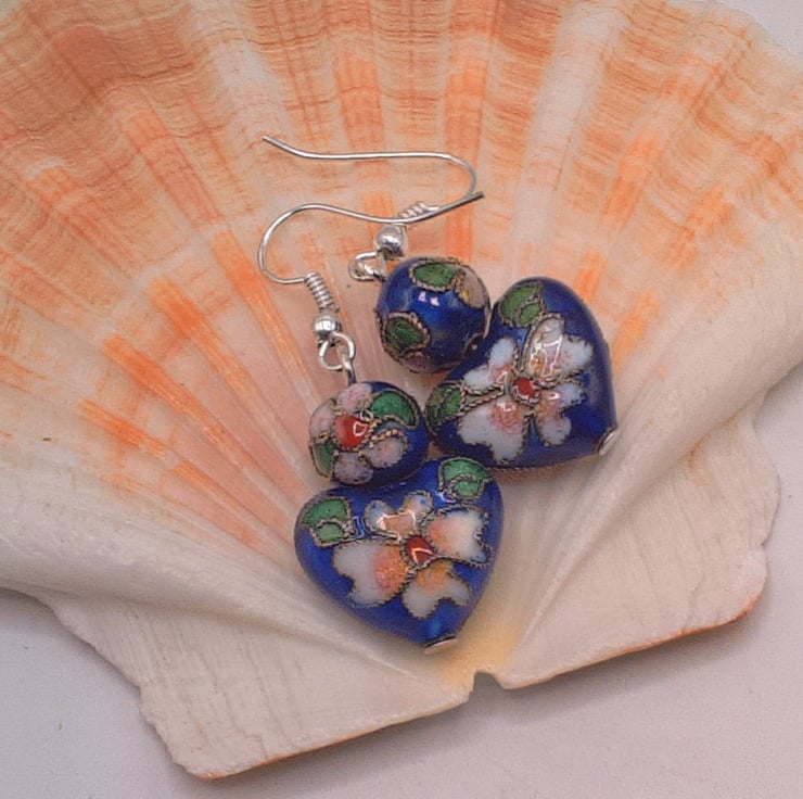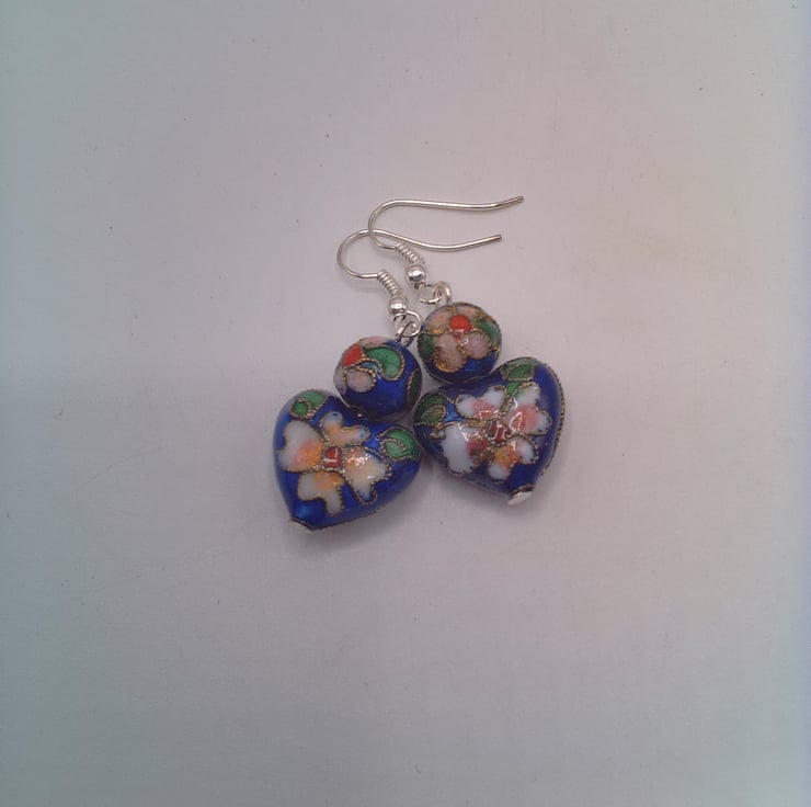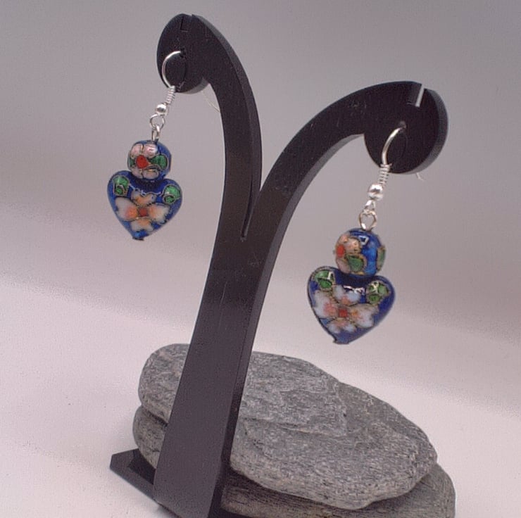 These beautiful deep blue heart shaped earrings go well with any outfit you wear everyday or for an evening out. They would make a lovely gift for a friend or relative for a birthday or anniversary, or a treat for yourself. They are made using 20 mm x 15 mm heart shaped cobalt blue cloisonne beads with a floral pattern and a 10 mm round cobalt blue cloisonne bead with a floral pattern. They are suspended on silver plated ear wires and they have a drop of 3 cm from the base of the ear wire. The earrings will be dispatched wrapped in tissue paper in an organza bag and delivered to you via Royal Mail first class post.