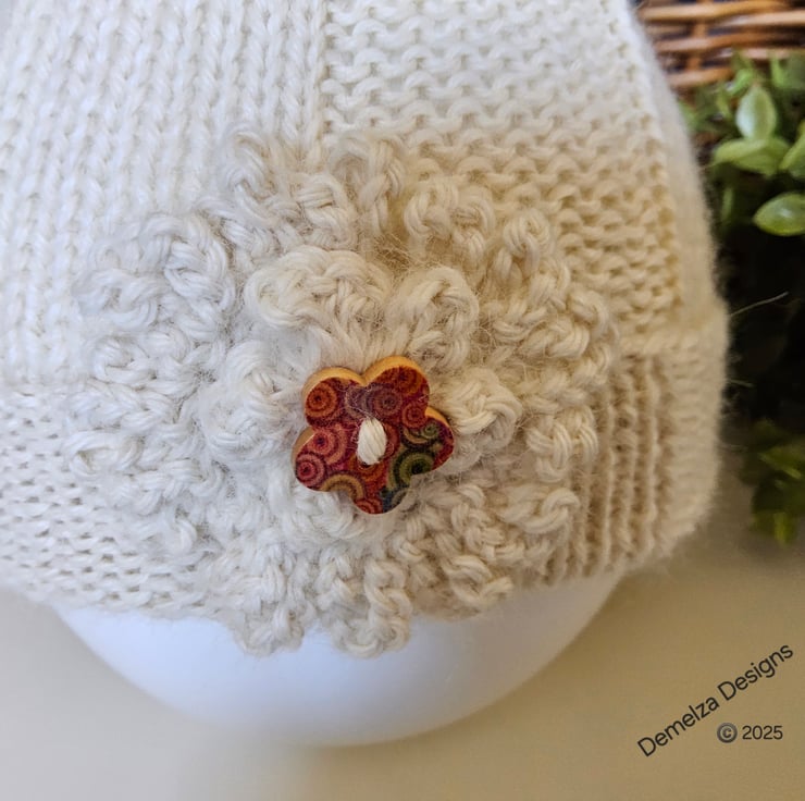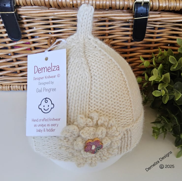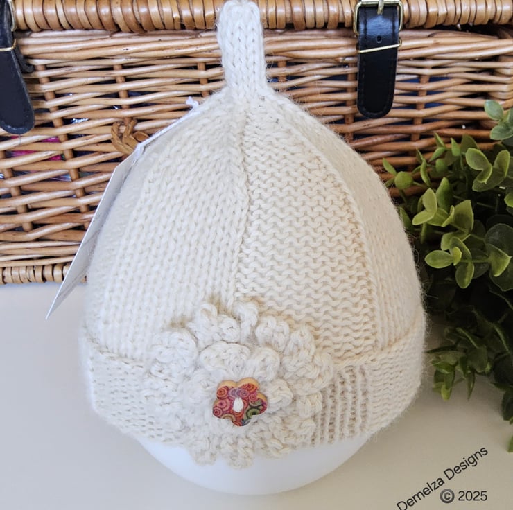 A beautiful luxury baby Girl's Pixie hat designed and hand crafted in Cornwall using machine washable 100% pure 'baby alpaca'. It is for those whom love this natural super soft fibre for their baby. It would make a perfect luxury newborn gift. The yarn tag is attached as proof of the items origins. The hat has a large hand crocheted flowers with a genuine wooden flower cut button which has a sweet floral design on it.