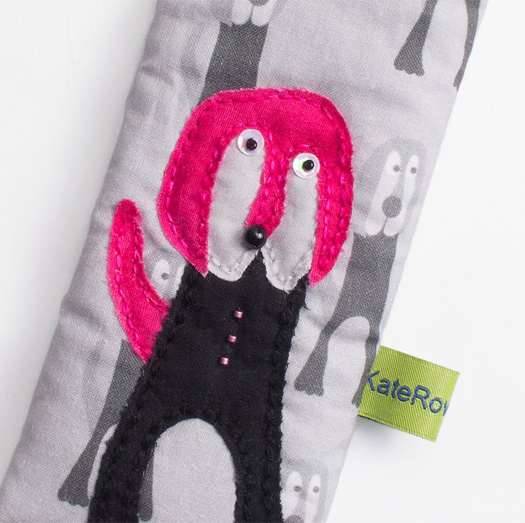 I have made the glasses case with my own dog print, charcoal dogs on grey background, printed on cotton. I have appliquéd a black dog with pink ears and tail onto the front. This has been embellished with beads. It is lined with grey cotton poplin and trimmed with black cotton poplin. The glasses case is wadded to protect your glasses. The item measures 17.5 cms(7 inches) by 7.5cms(3inches).