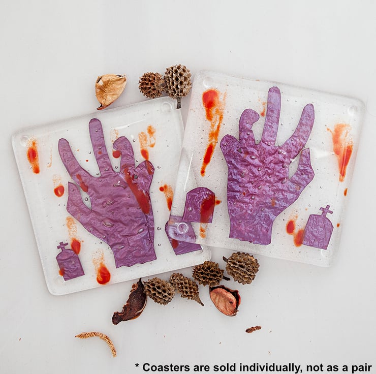 What better way to protect your surfaces this Halloween than with these blood splattered, zombie graveyard coasters! They're completely handmade with copper foil hands and tombstones fused inside clear glass splattered with red powdered glass to give the blood effect. The copper foil oxidises giving them an unpredictable red/bluish colour (generally reddish though). There are two currently available with the hands facing different ways so perfect as a pair.