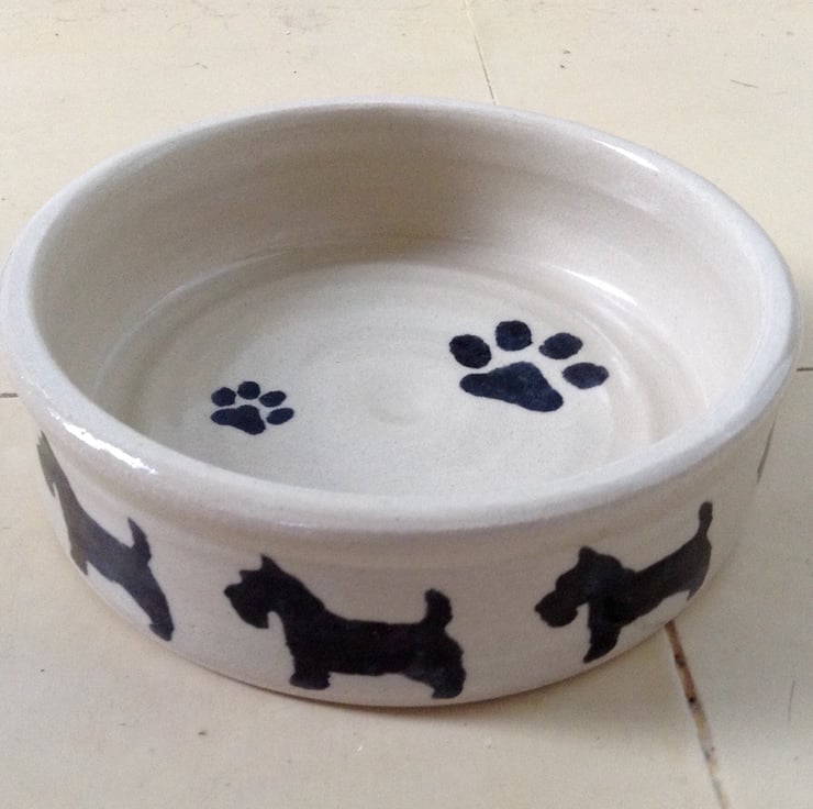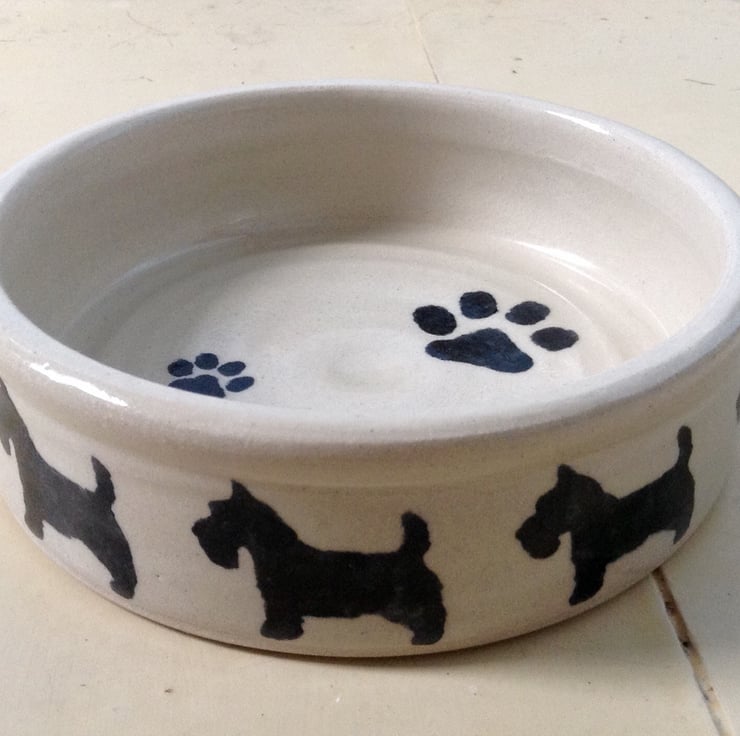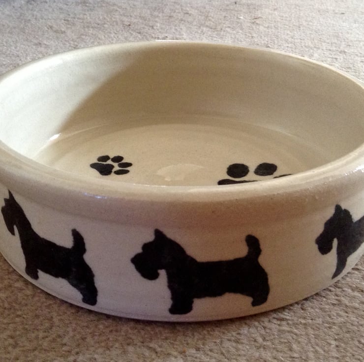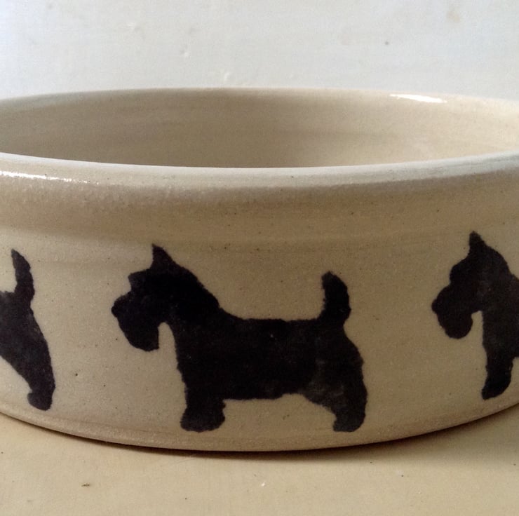 Hand thrown stoneware dog bowl with black scottie dog decoration. High fired stoneware and microwave and dishwasher safe. The bowl measures 19 cms across and is 6 cms high. It is a nice substantial weight, 950 gms, so that your doggy doesn't lick it all round the kitchen!