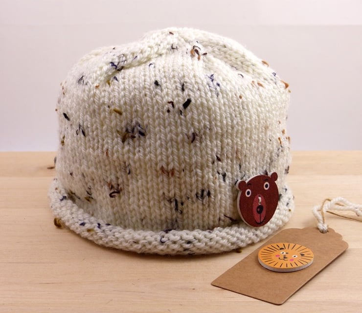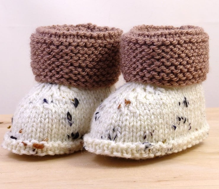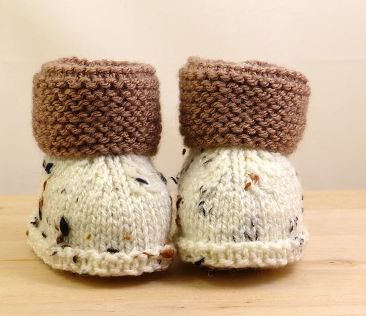 A pair of hand knitted booties in a natural flecked cream yarn with the top in a chocolate brown. Both yarns are 100% acrylic. The booties measure approximately 4" from heel to toe, have a ribbed cuff, and turn down top. A matching hat is also available in my shop. This item will be sent by Royal Mail packed to arrive safely. A ideal gift for a new baby.