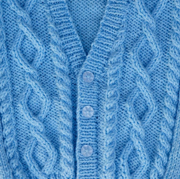 hand knitted babies cardigan in an aran style with patterned fronts and sleeves to fit chest size 46cms (18inches) approx age 6 to 12 months, sleeves 17cms (6.5inches)