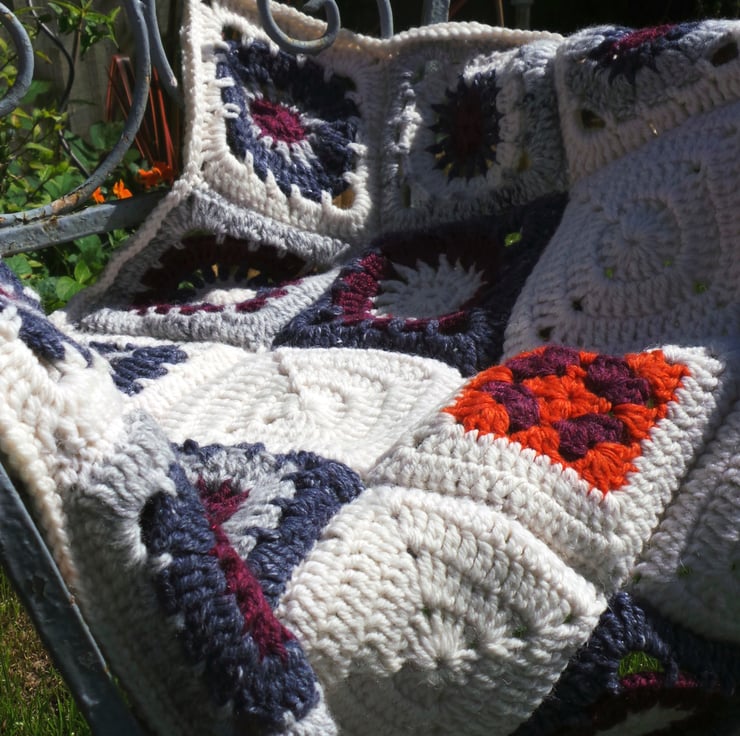 A handmade/ hand crocheted (by me!) chunky yarn blanket. A splash of orange in the centre surrounded by cool greys, cream and plum.