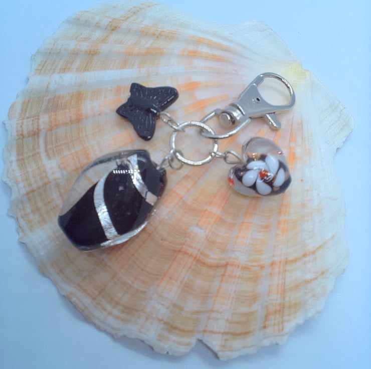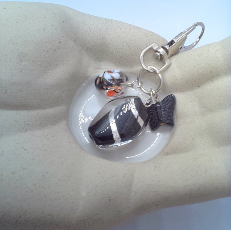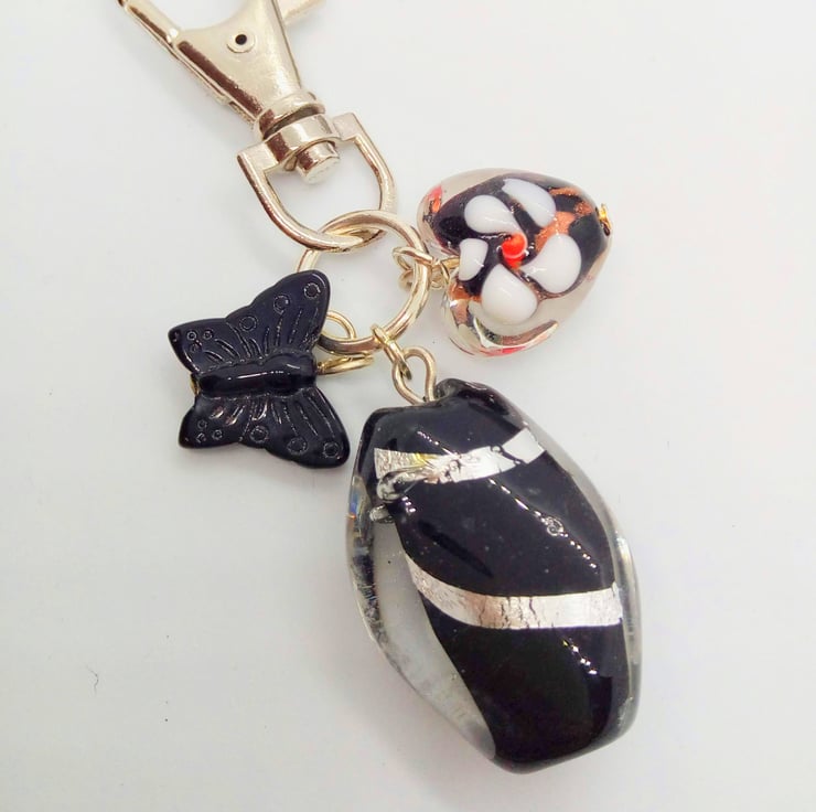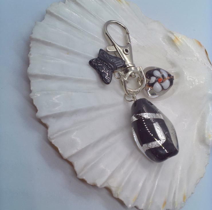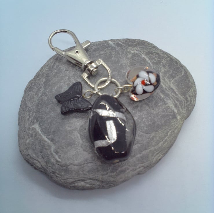 This fun and practical silver plated Bag Charm would make an ideal gift for a friend or relative, a treat for yourself, or for an end of year gift for a teacher. The Hand Bag Charm Clip is silver plated and has a black glass butterfly charm, 10 mm x 15 mm, a black and clear lampwork heart bead, 15 mm x 15 mm and a large black lampwork bead, 25 mm x 20 mm. The overall drop of the charms is 45 mm, from the bottom of the swivel clasp to the bottom of the charms. The bag charm will be dispatched wrapped in tissue paper in an organza bag and delivered to you via Royal Mail first class post.