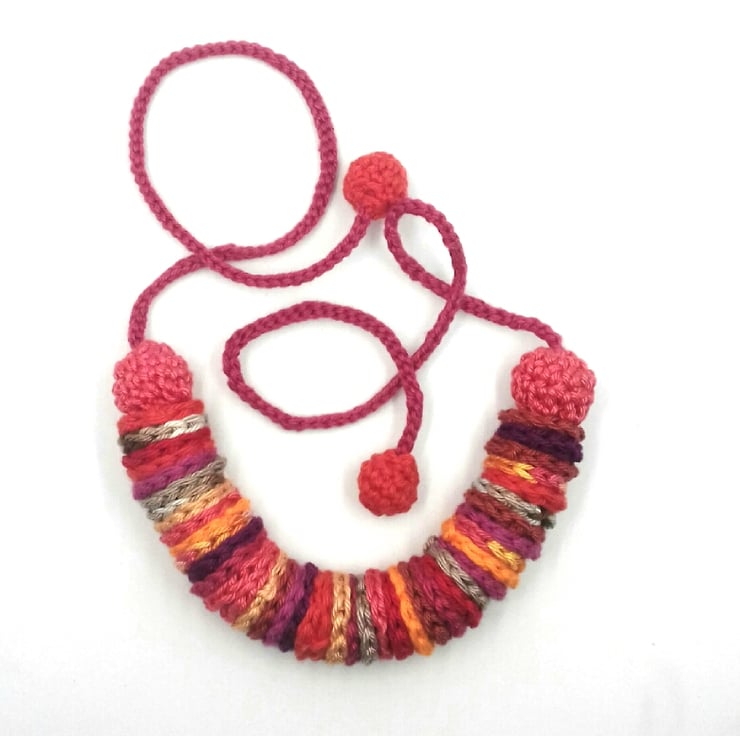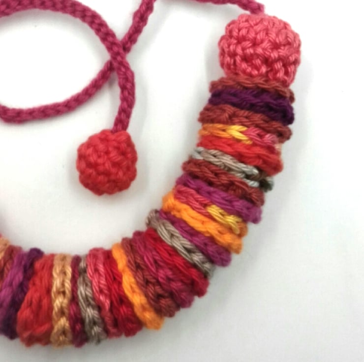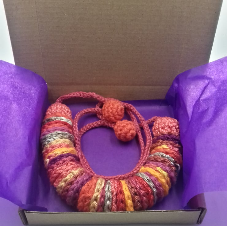 This pretty necklace is made up of 42 cotton discs threaded onto a cotton cord and finished with covered wooden beads and cotton 'beads' for easy tying. All the elements have been lovingly crocheted by me and the whole necklace measures approximately 74 cm from end to end and can be worn at different lengths. The necklace is in bright autumnal shades of oranges, red .beige ,purple , coral, mauve.