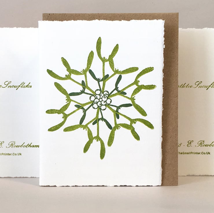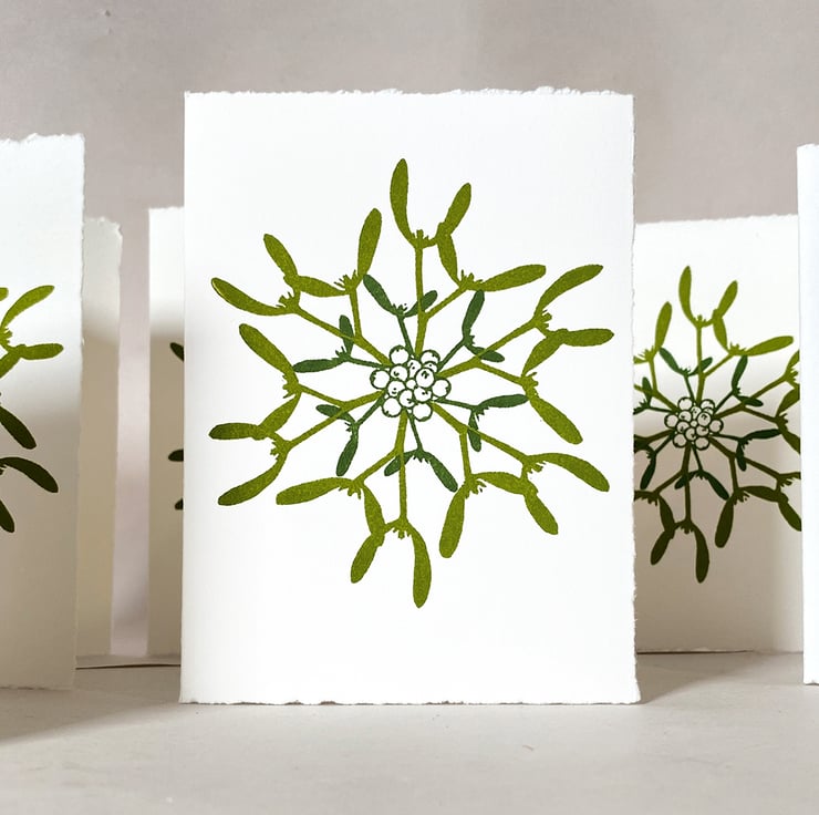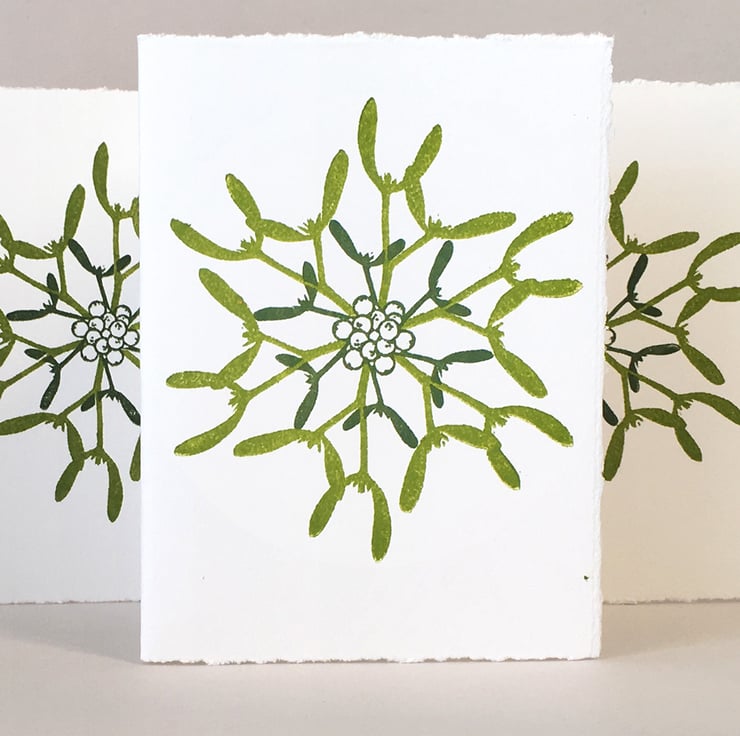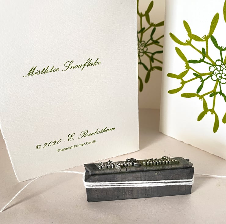 This Mistletoe Snowflake is formed from two Lino blocks which I’ve built & cut. I’ve mixed two shades of mistletoe green from slightly different amounts of blue-green & warm yellow inks. I hand inked the berries & smaller leaves in the darker shade & the larger sprigs using the lighter shade.
