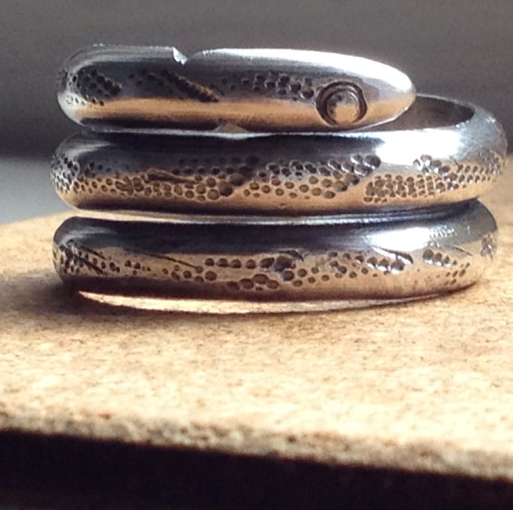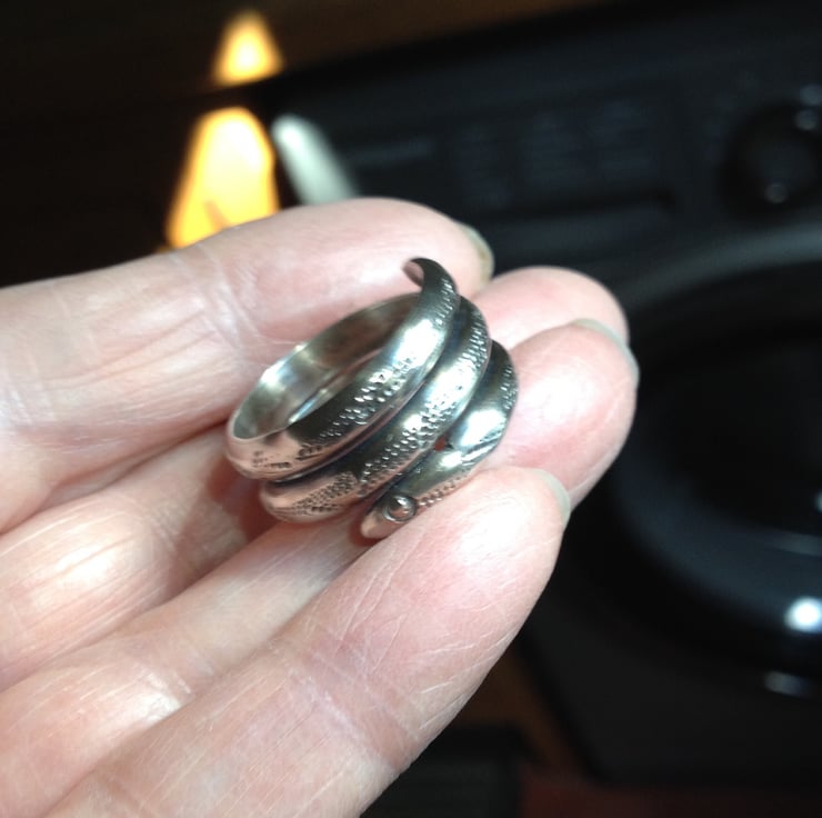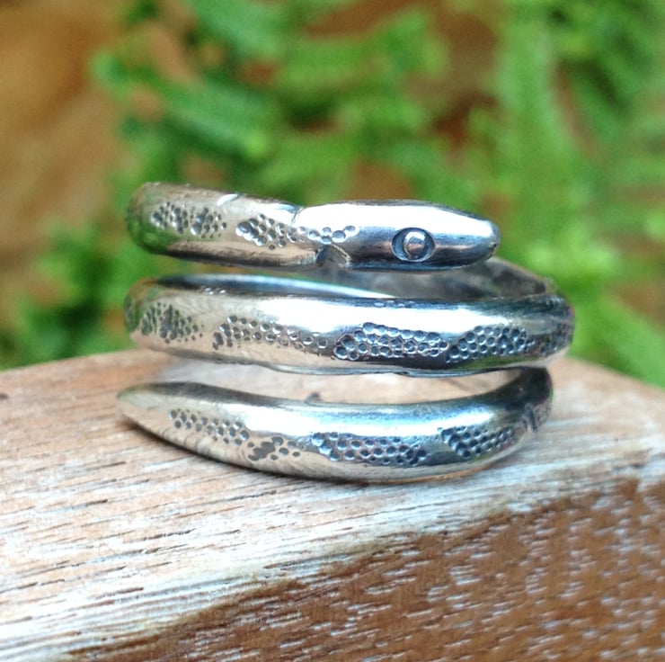 Sterling silver wire stamped and hammered to make this heavy silver snake ring. The ring size is slightly adjustable so you can get a perfect fit. Comes in 3 sizes.
