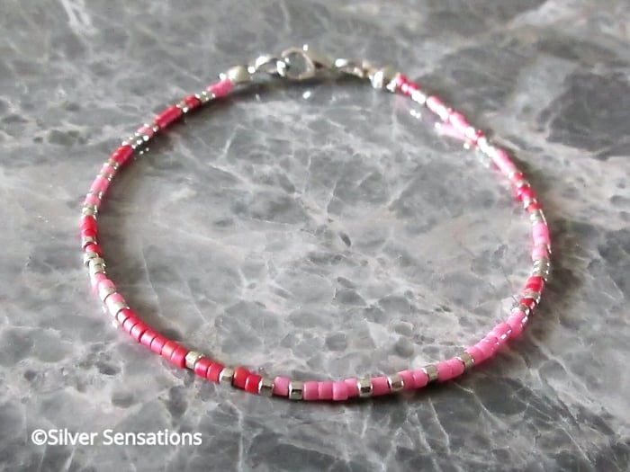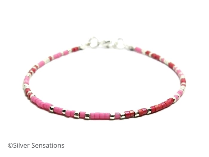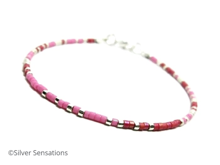 This is a dainty pink & red seed bead friendship bracelet handmade with high quality Miyuki Delica seed beads which are just under 2mm in size.