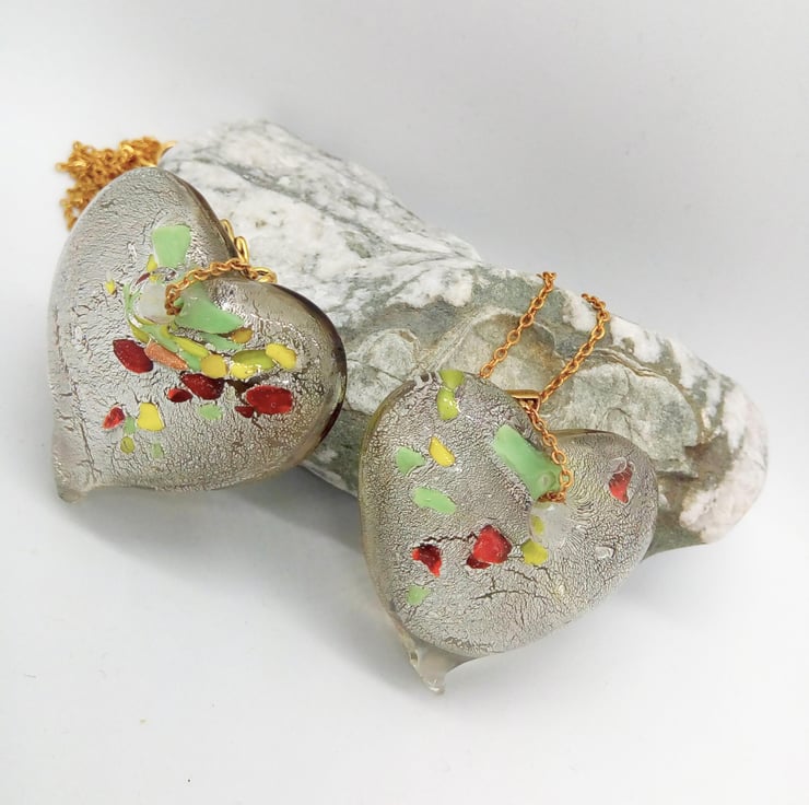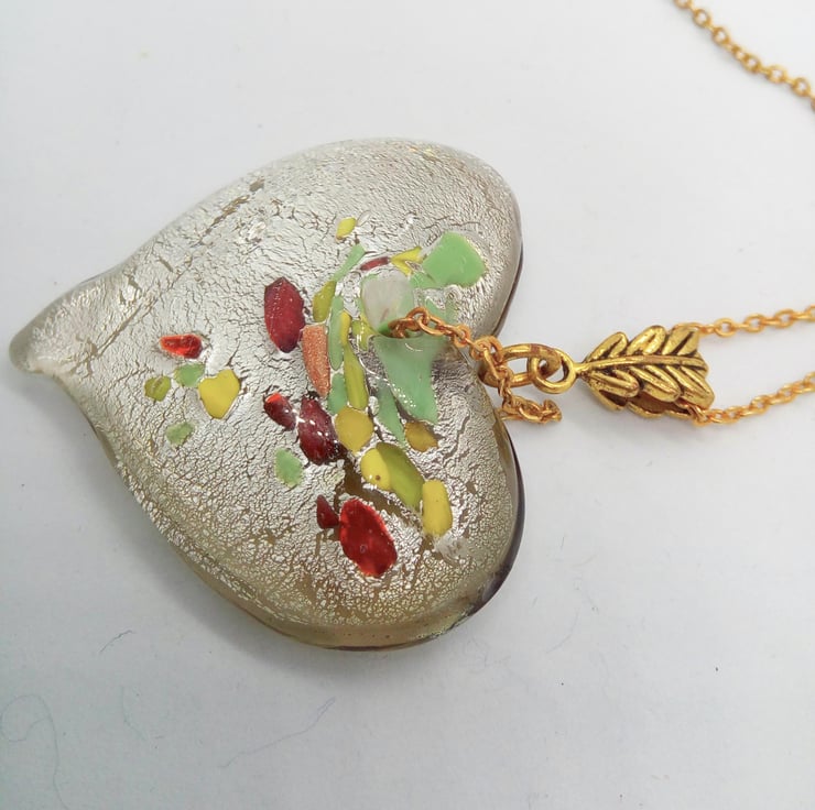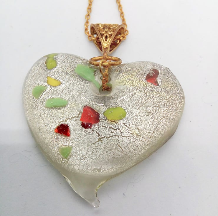 The pendant is a clear glass heart shape and it is patterned with yellow, green and red flecks. The pendant measures 45 mm x 35 mm and it is then suspended on a gold plated fine chain. The chain is secured with a gold plated lobster clasp. The necklace is 18 inches long and the pendant has a drop of 6 cm from the chain.