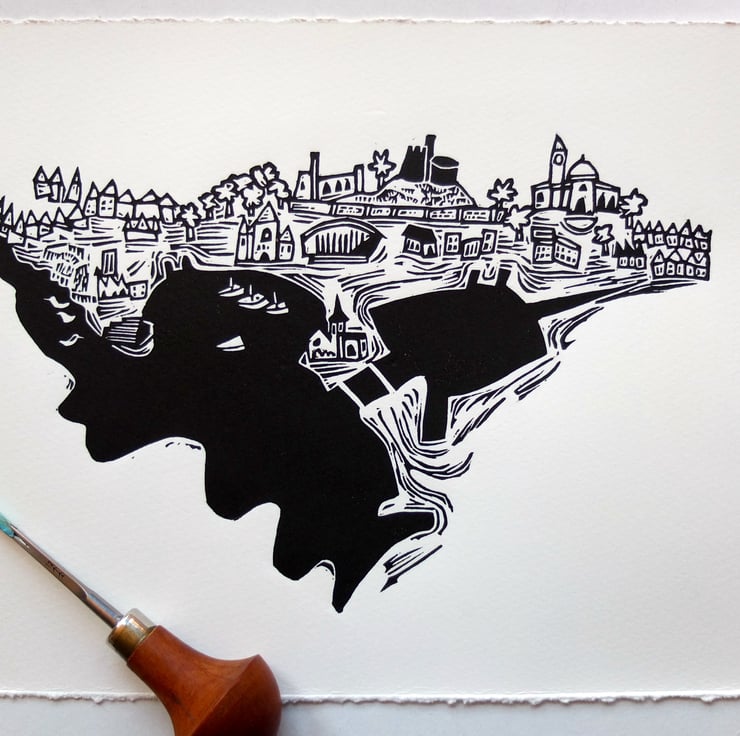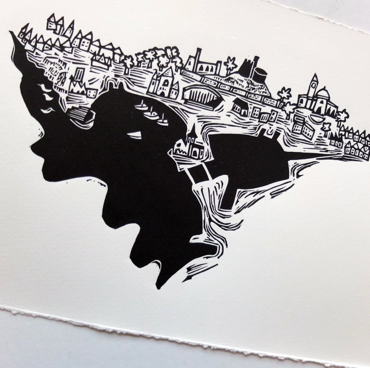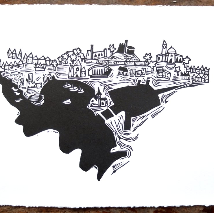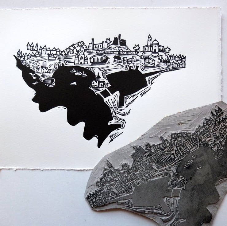 A little lino print of beautiful Cardiff Bay, panning back through the city to the Castle. I hope you can spot the Norwegian Church and other landmarks in the picture!