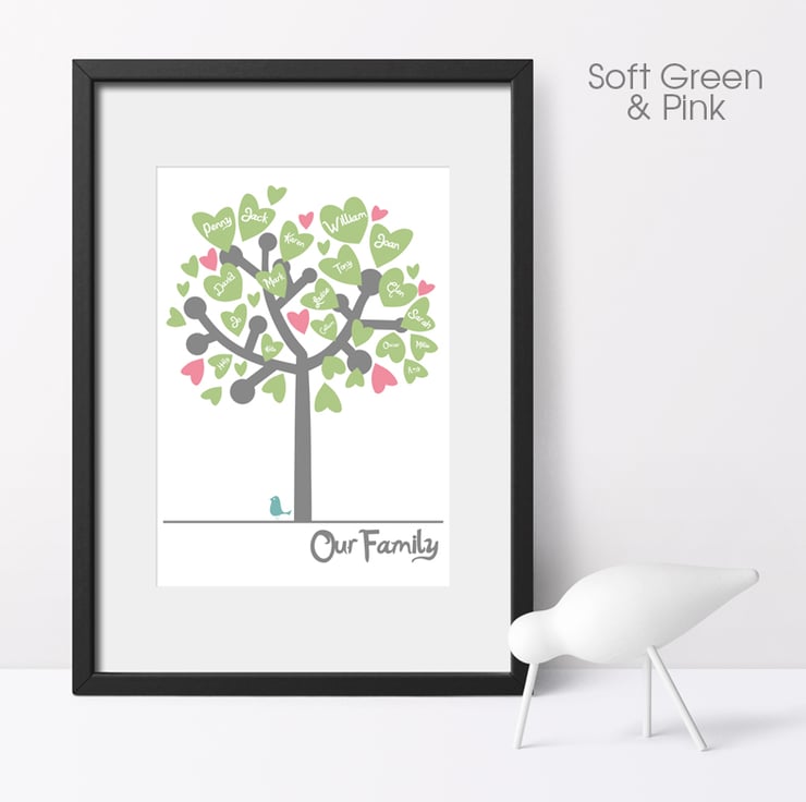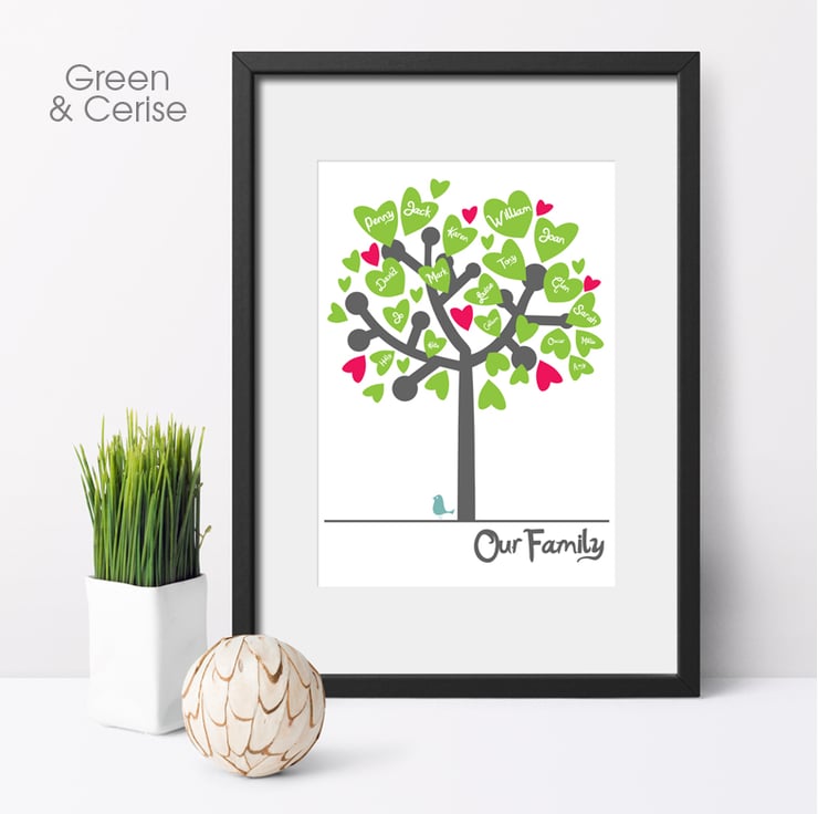 This personalised Family Tree print is created to order, just for you. Featuring up to 3 generations of your family and 30 names, the print is available in a choice of colours and sizes too.