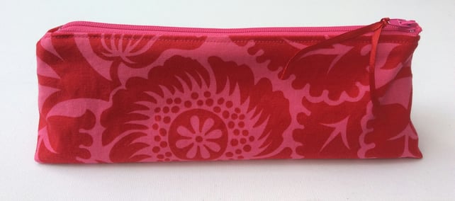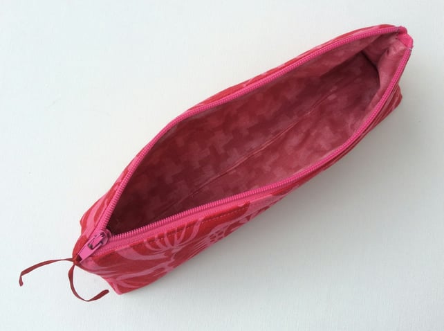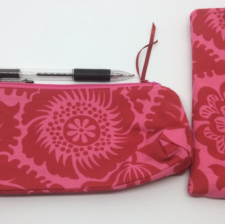 The matching pencil case or make up bag has a pink zip with a red ribbon zip tag. The pencil case measures approximately 20cm x 8cm x 5 cm at the base and is squared off at the corners so it will stand up.
