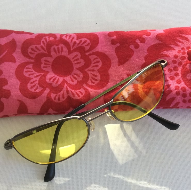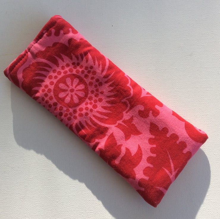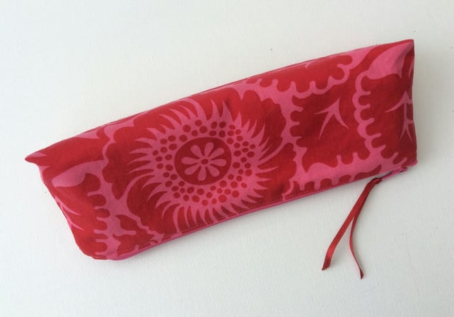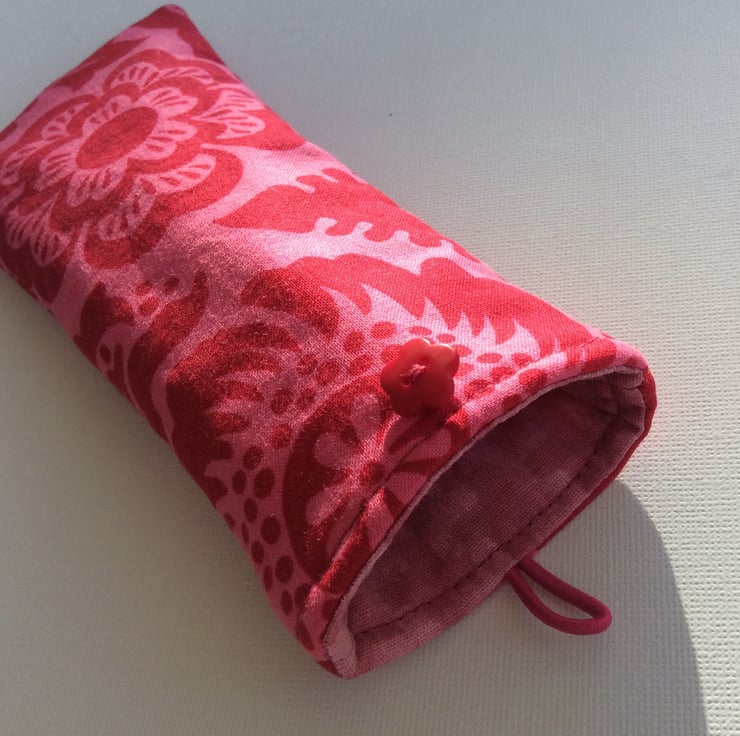 This sunglasses or glasses case is made from cotton with large red blossoms and leaves on a pink background. The lining is also cotton, a geometric pattern of two shades of pink. The case is lightly padded and has a pink elastic loop and red flower button closure. The case measures approximately 18cm x 7.5cm.