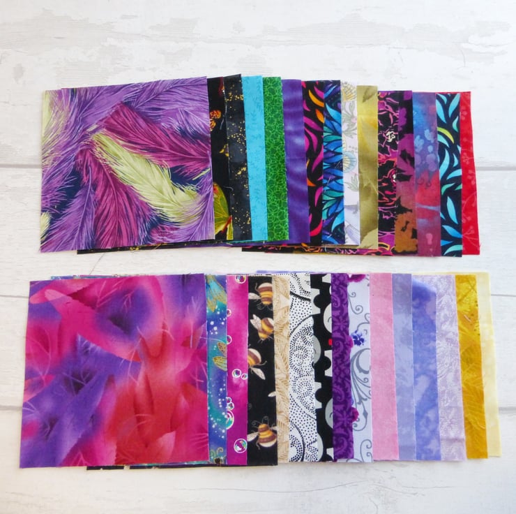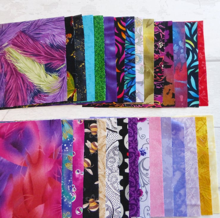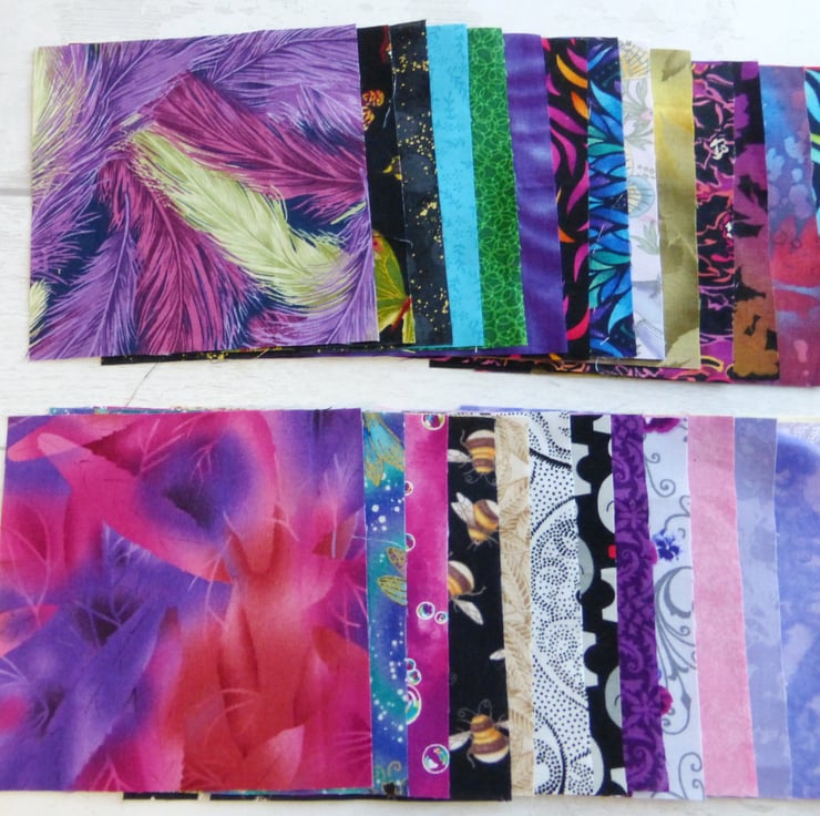 They are all quilting weight cotton and each one is approximately 5" square (12.5 cm)
