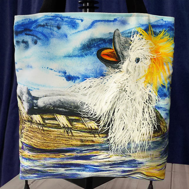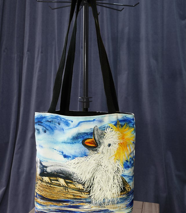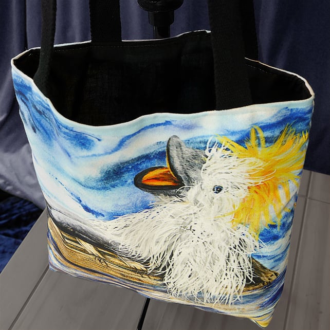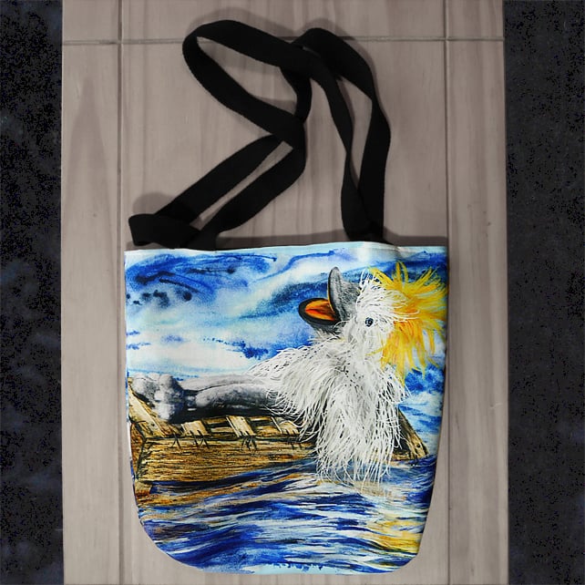 This cheerful bag features a bright printed illustration of Algy, a surprisingly fluffy bird, adrift on his raft in the middle of the ocean, singing sea shanties at the top of his voice. The illustration appears in the first book in the Adventures of Algy series, "A Surprisingly Fluffy Bird".