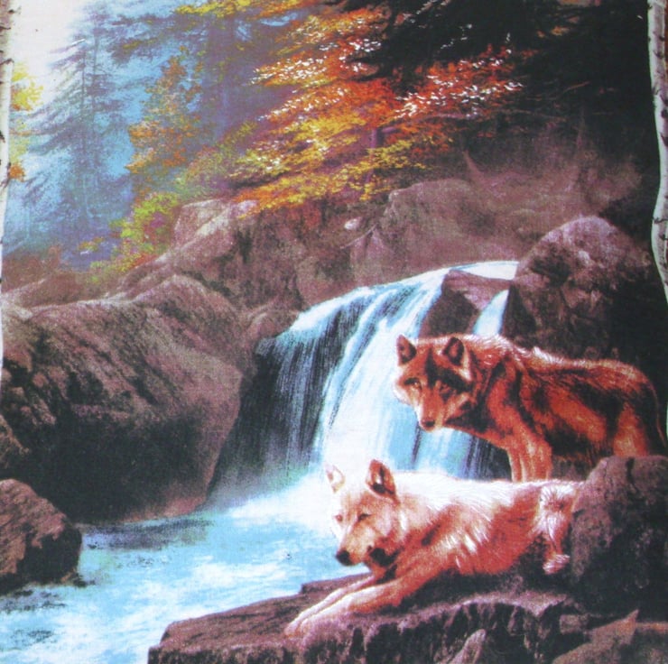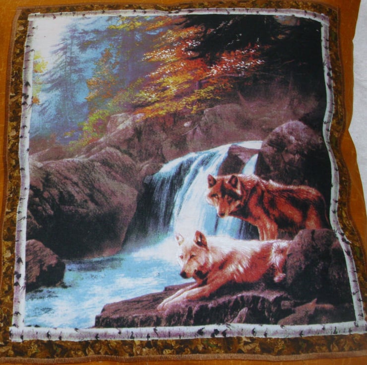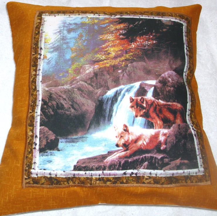 Wolves standing by a river in Autumn cushion with two wolves by a river with a waterfall rushing past, watching and waiting on the slippery boulders by the fast rushing water, in the distance are trees in autumnal colours.