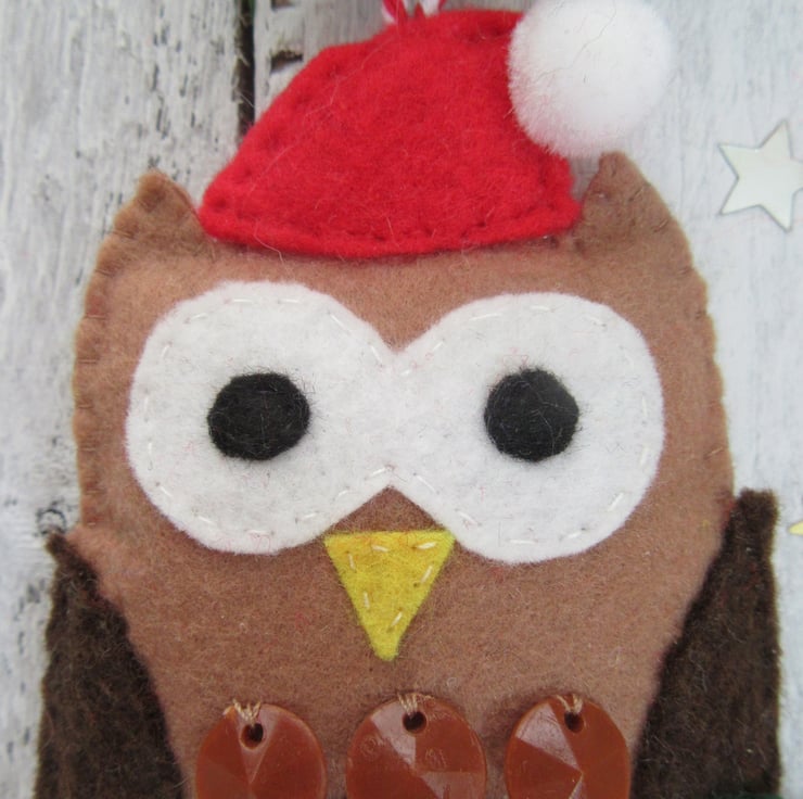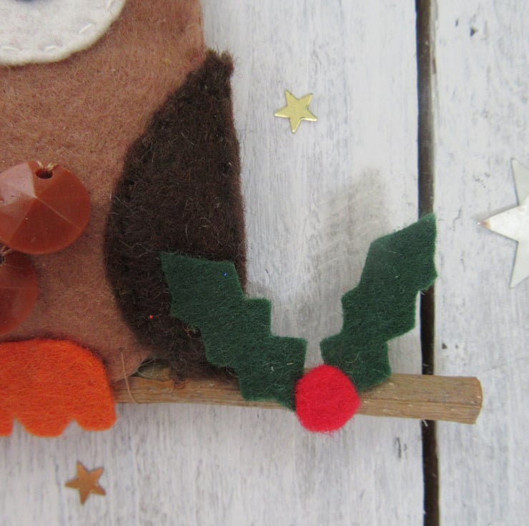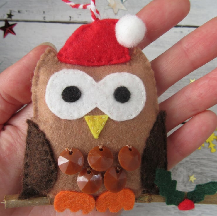 Each owl Christmas tree decoration is hand cut and stitched from my own design using light and dark brown felt, yellow beak, orange feet and a cute red Christmas hat, complete with white pompom , they have brown bead feather details on the front. Each is lightly stuffed and attached to a twig branch, with felt holly leaf and berry detail. It can be hung using the striped red and white cord.