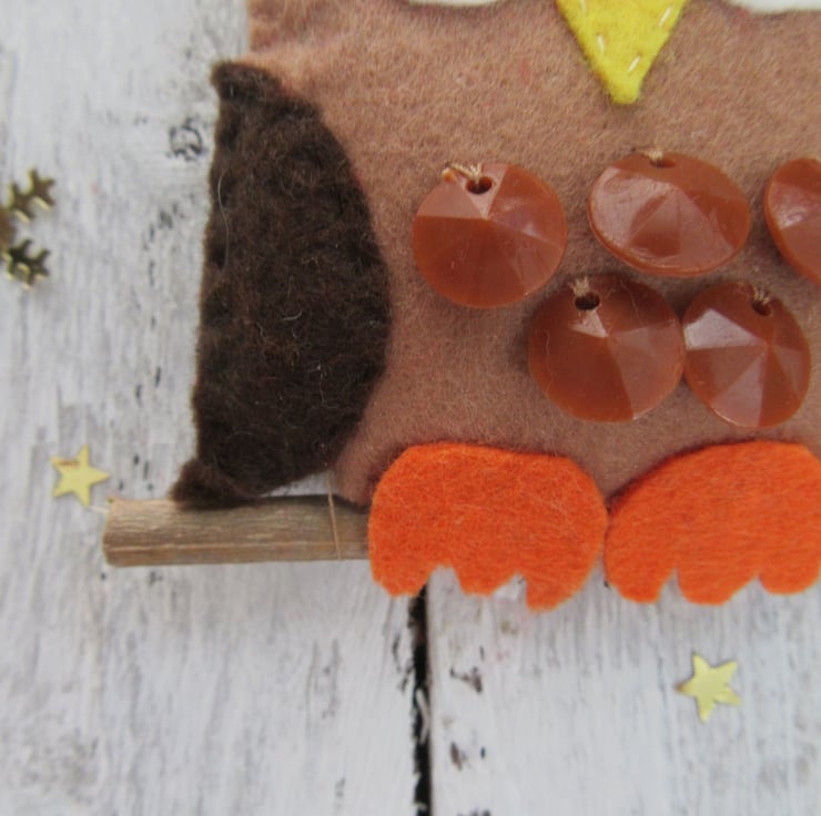 Hand stitched owl decoration, the perfect owl ornament to give as an owl lovers gift.