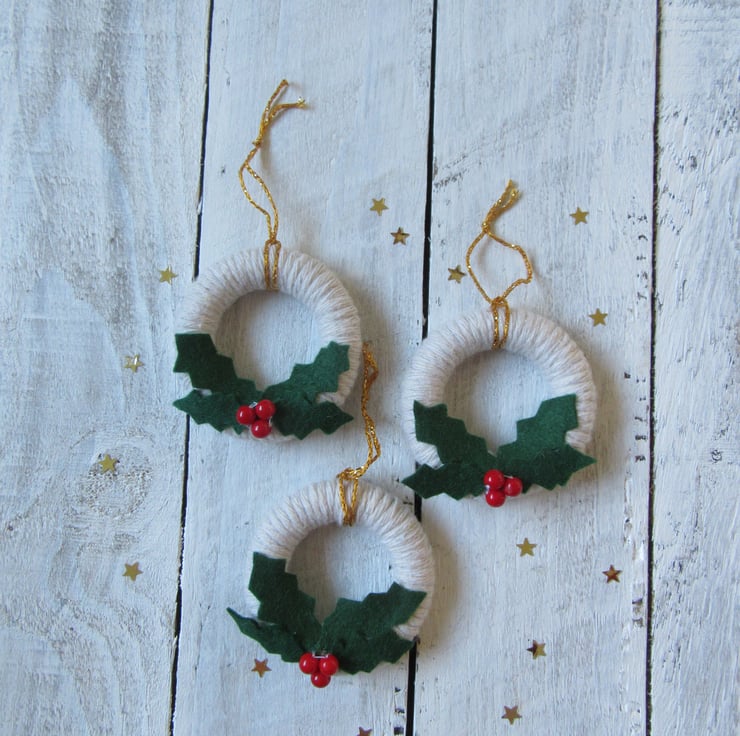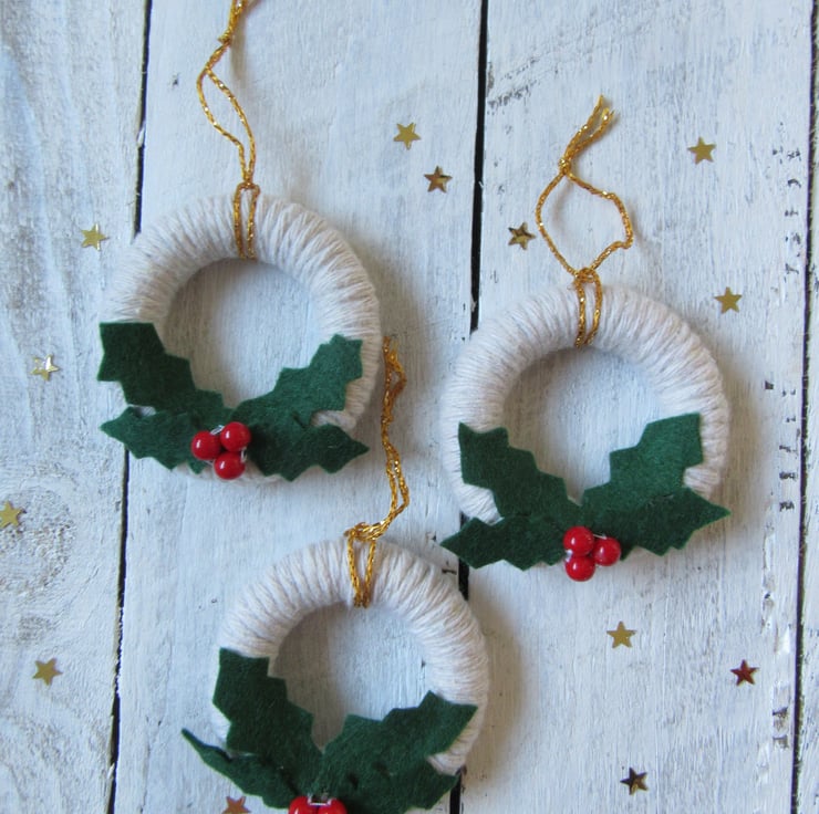 Set of three contemporary Christmas tree decorations in holly wreath design.