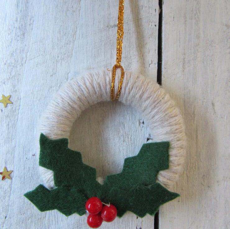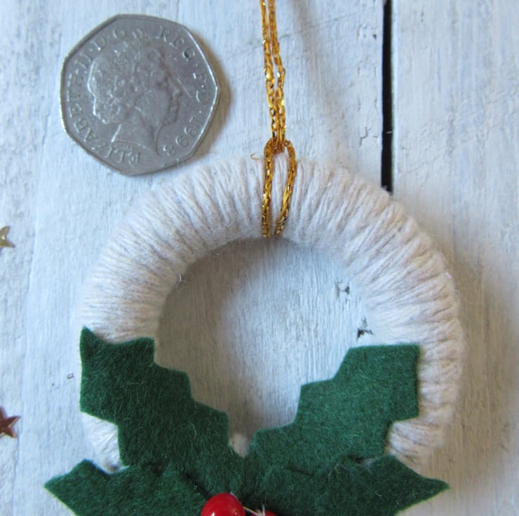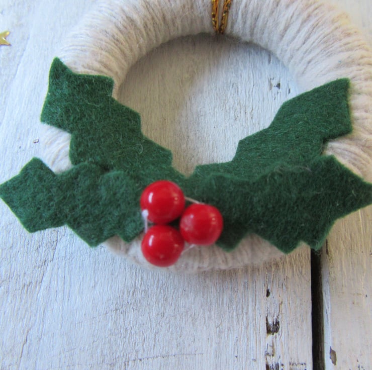 These Christmas decorations have been upcycled from solid wood curtain rings, covered in neutral twine, with dark green felt holly leaves and three red bead holly berries, securely sewn in place. They are hung using the gold thread.