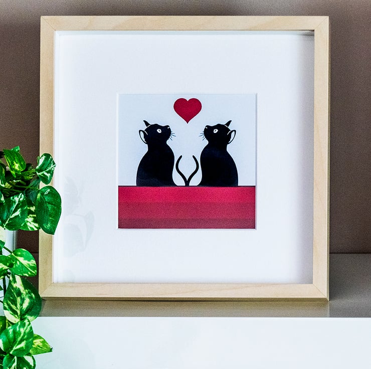 I also do a red version of this print where the cats are gazing up at a red heart as shown in the second photo - please see my other listing to purchase. I also do both images as greetings cards which can be found in the relevant section of my shop.