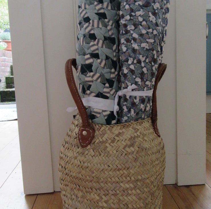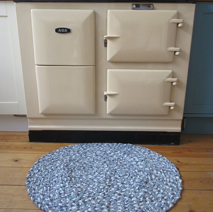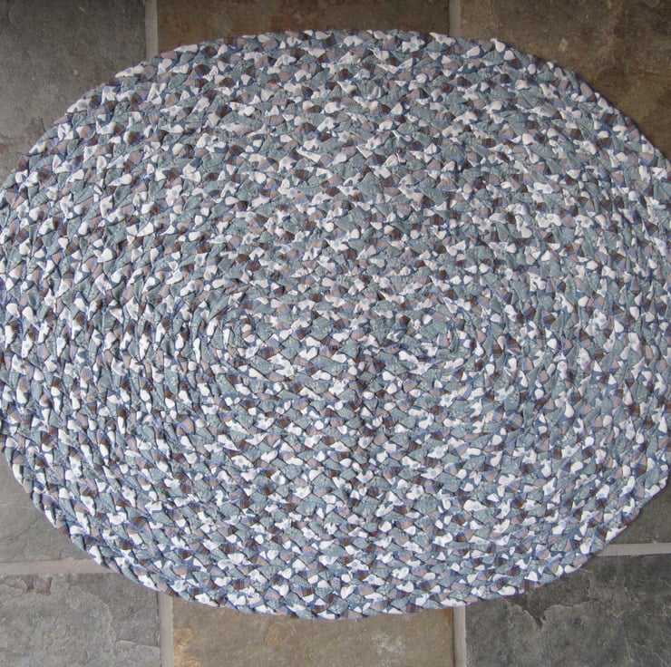 A beautifully hand braided oval rug using 100% cotton fabrics. The three different fabrics are: A 'Roma' fabric in slate grey with white daisy flowers; brown and blue tartan; Clarke & Clarke "Ebba" in blue and off white. It has been machine sewn together for extra strength using a blue thread. I have washed my own braided rugs on a gentle 30' wash and line dried them. Perfect in front of the Aga, bathroom or back door.