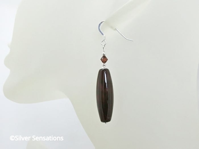 These simple dark Red Agate earrings have long 30mm x 10mm cylinder shaped glossy beads.