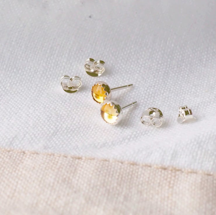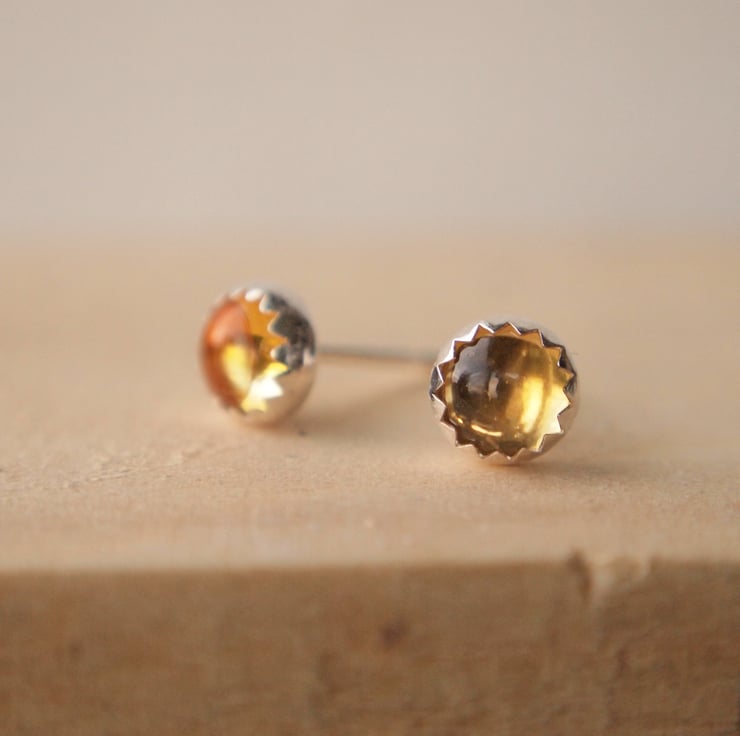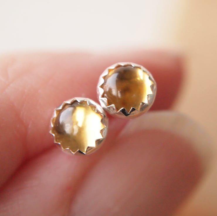 Citrine and Sterling Silver Gemstone Studs. Warm yellow Citrine gemstones carefully set by hand onto sterling silver mounts. The gemstones are round in a cabochon cut and measure 5mm in size. They measure 5mm in size and come complete with butterfly backs Citrine is birthstone for November, making these a perfect way to wear your birthstone.