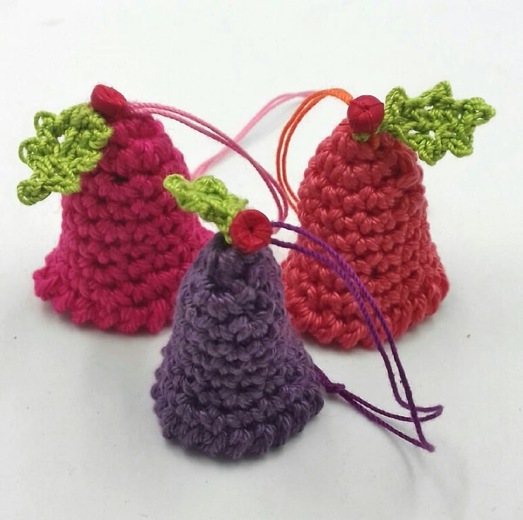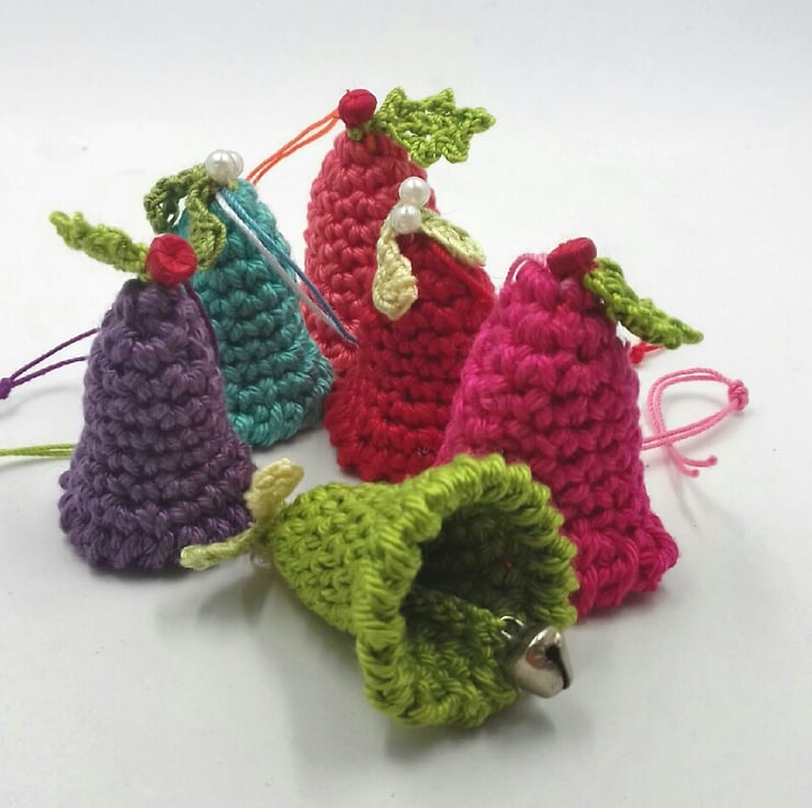 These six colourful little bells would add festive cheer to any tree! They are crocheted in cotton and really jingle due to the tiny bell dangling inside. They are crocheted in cotton and three are decorated with a tiny sprig of mistletoe, three with a tiny holly leaf and wooden berry. Each bell measures approximately 3.5 cm tall and has a loop of crochet cotton to hang it by.